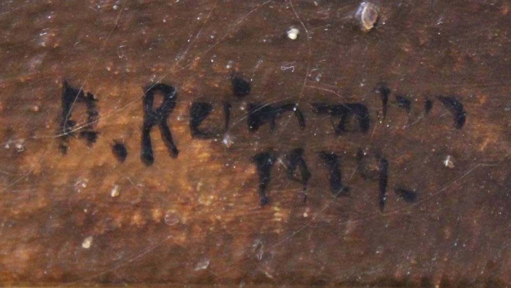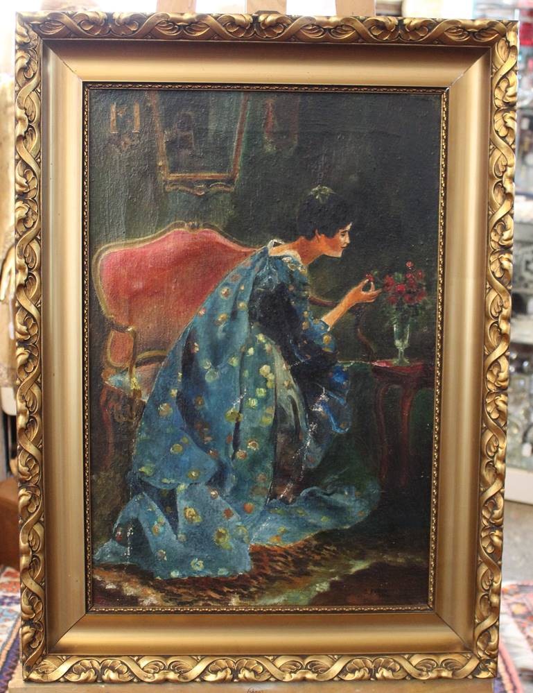 A.Reimann 1924, Dame in blauen Gewand, wohl nach V.Schramm, Öl/Leinwand, gerahmt, RG 74 x 54,5cm, restau.bedürftig [1]
