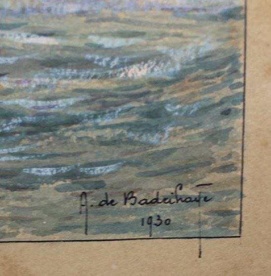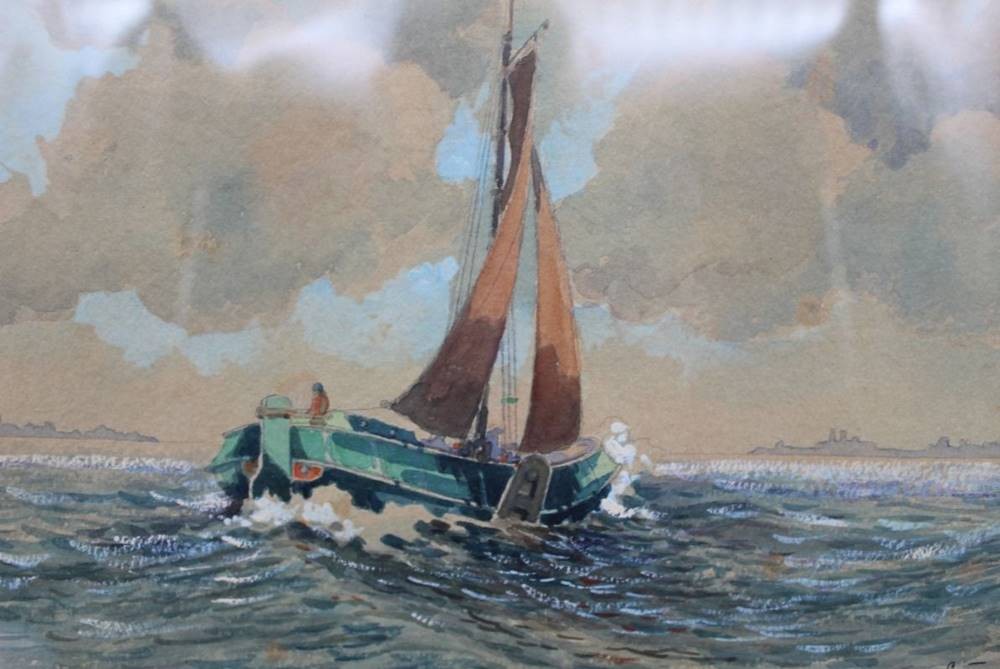 Albert DE BADRIHAYE (1880-1976) "Fischkutter auf der Elbe" 1930, Aquarell, ger/Glas, RG 26x34 cm, war Prof., lebte in Otterndorf, gestorben in Cuxhaven [1]