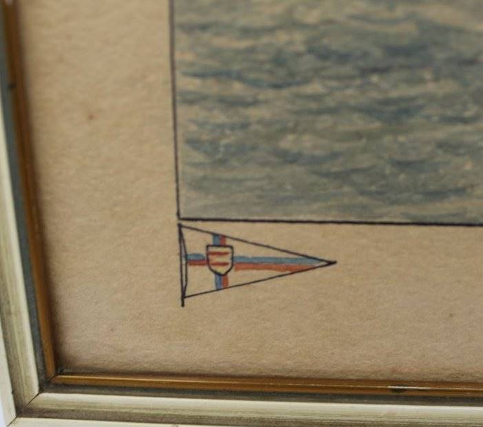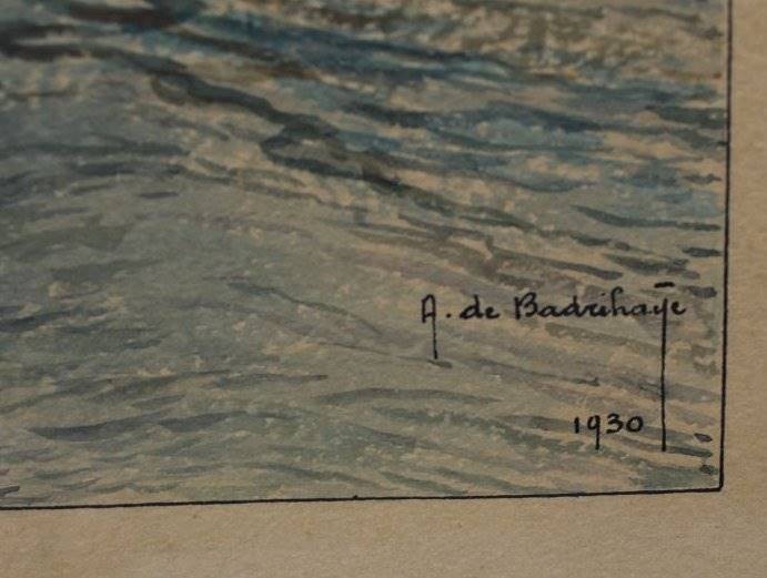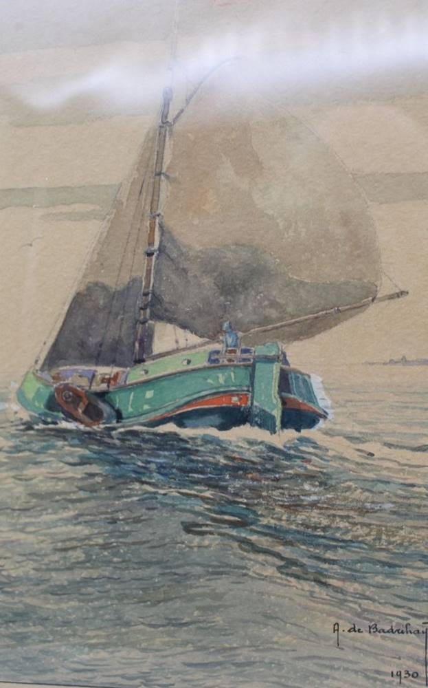 Albert DE BADRIHAYE (1880-1976) "Fischkutter auf der Elbe" 1930, Aquarell, ger/Glas, RG 34x326cm, war Prof., lebte in Otterndorf, gestorben in Cuxhaven [1]