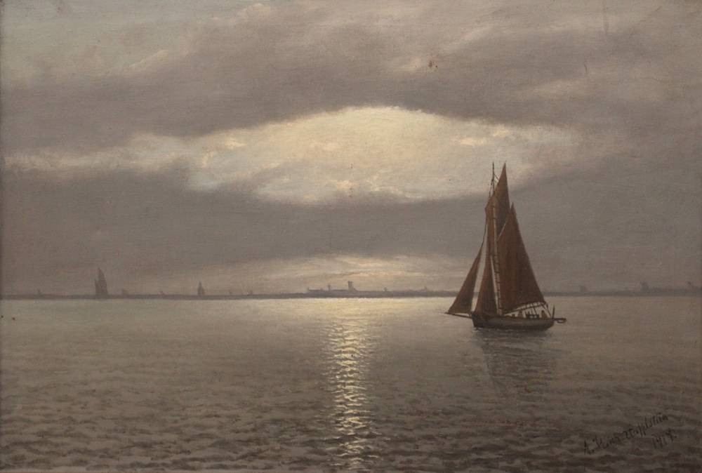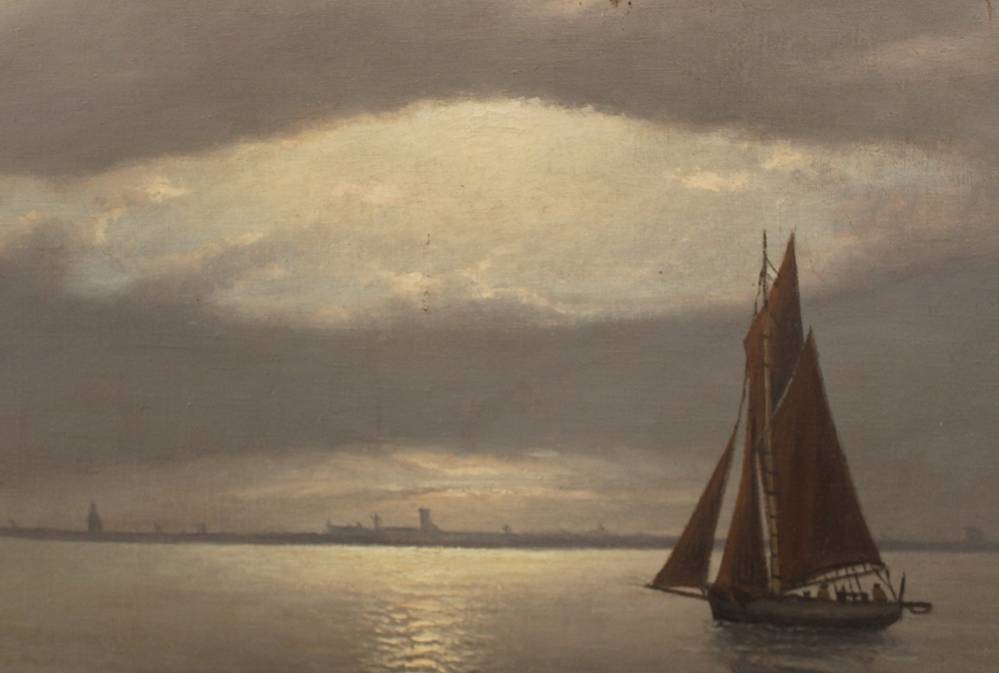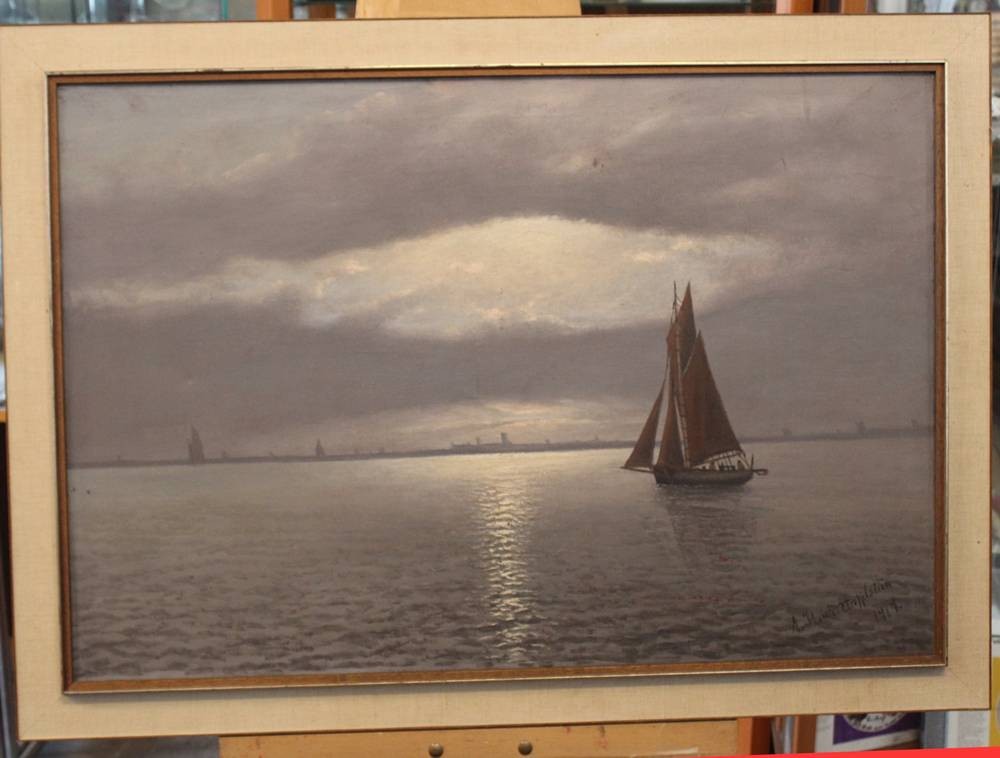 Alexander REICH-STAFFELSTEIN (1871-1954) , Segelboot am Abend, 1919 datiert, verso auf Rahmen "Heimkehr am Abend", Öl/Leinwand, gerahmt, RG 76,5 x 106,5cm, leicht restau.bed., Speergutversand!