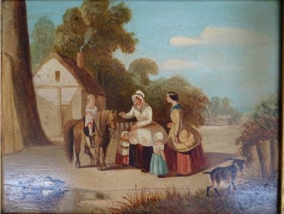 Altmeister des 19 Jhd., engl. Schule des 19.Jhd., Dorfplatz mit Figuren, Öl/Holz, alt gerahmt, 32x38 cm, altes Etikett verso. [1]