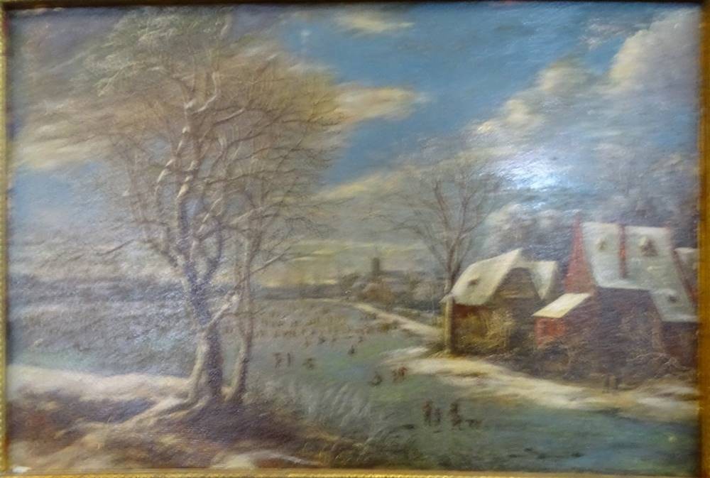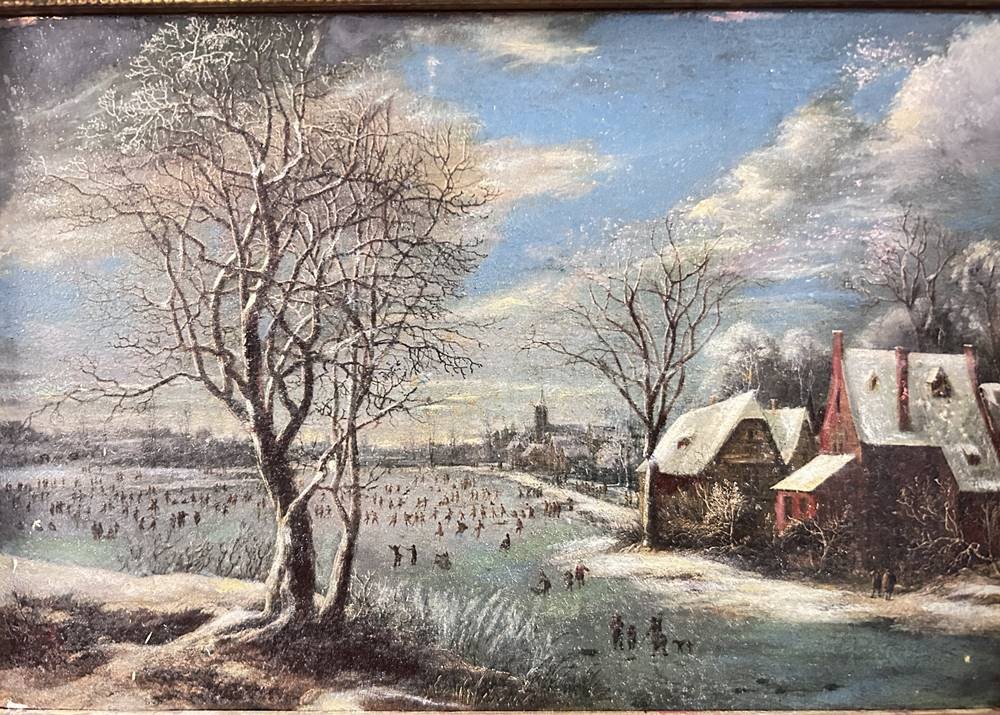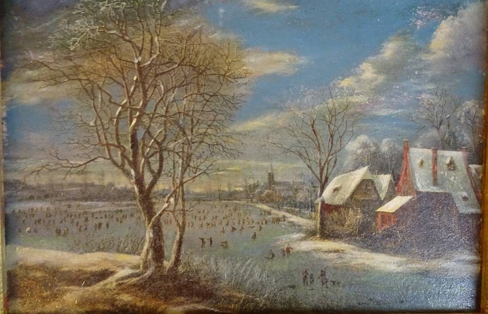 Altmeister "Winterlandschaft" verso betitelt "Abel Grimmer 1573-1619" Öl/Leinen, doubliert auf Metallplatte?, gerahmt, RG 31x39 cm [1]