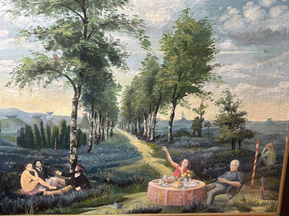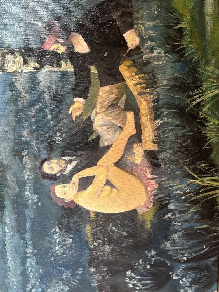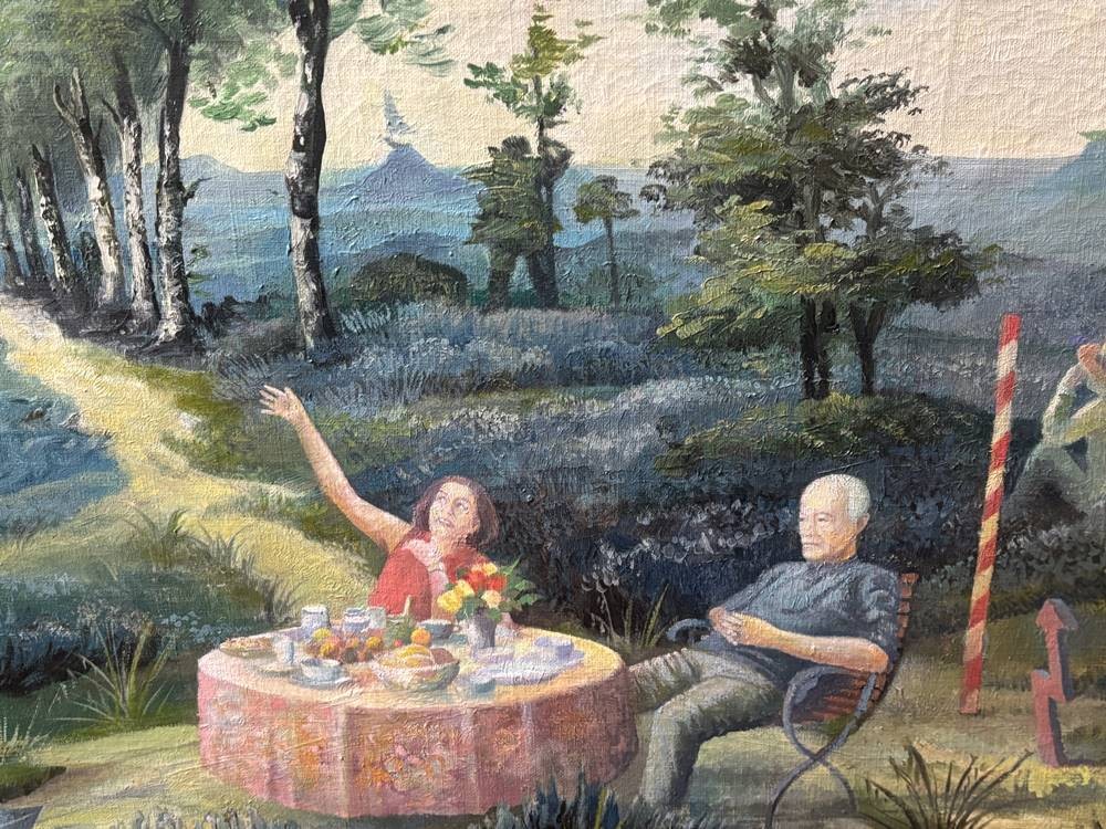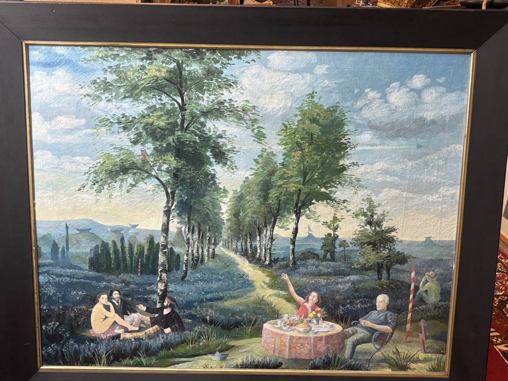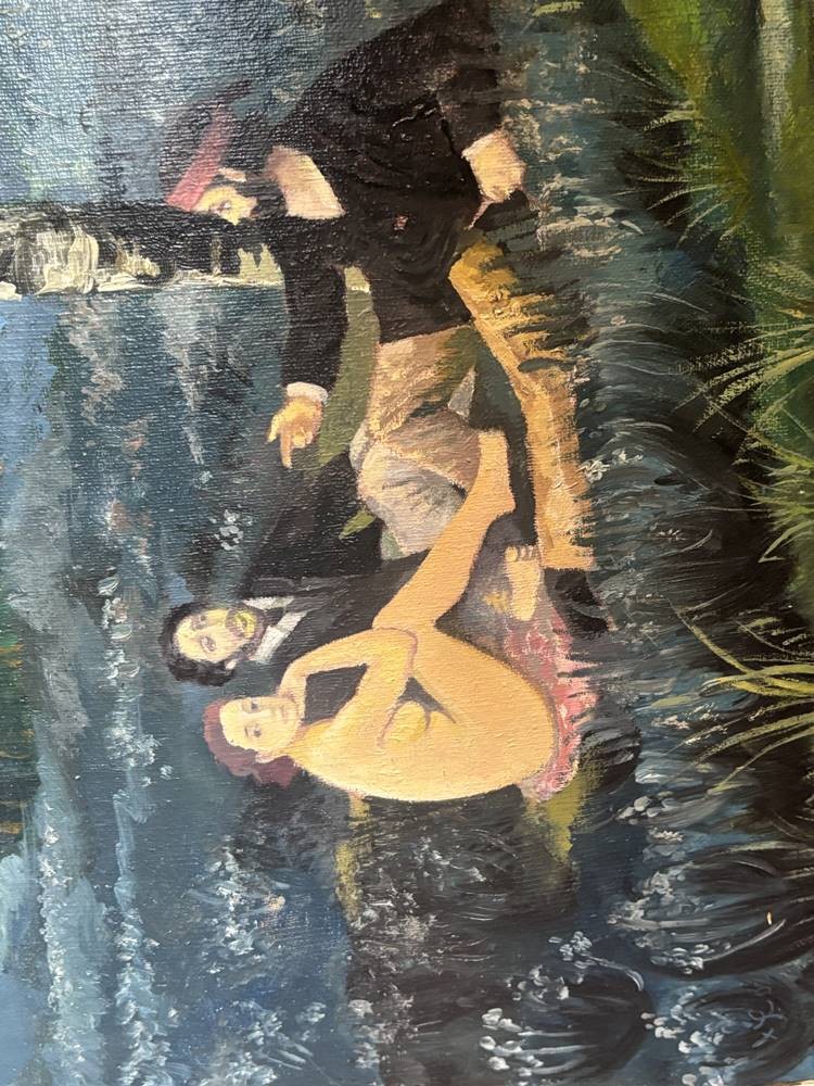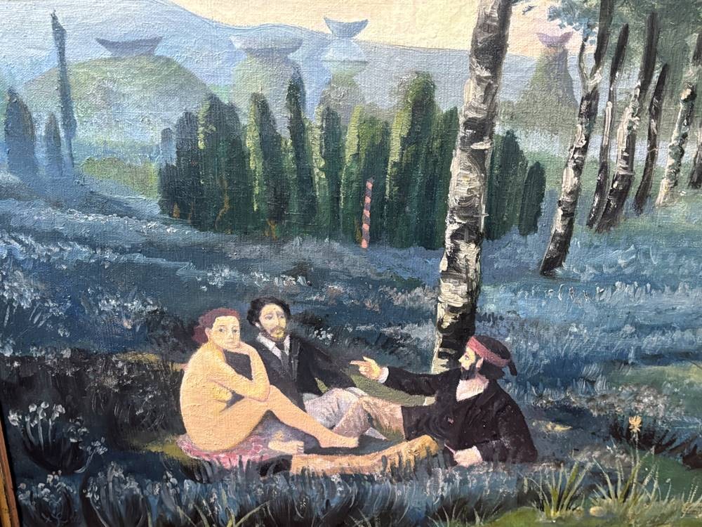 anonym? "Picknick-Szene" in Anlehnung am Ed. Manet, Öl/Leinen, gerahmt, RG 112x90 cm, (Sperrgut-Versand) verso Zeitungsbericht anbei von Bernhard Echte und Walter Feilchenfeldt