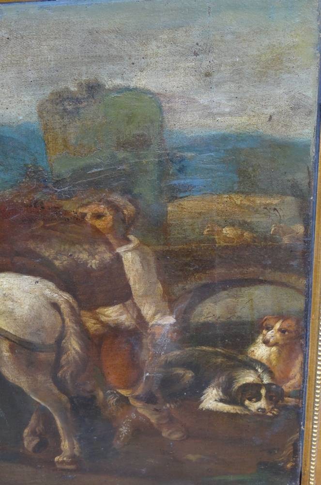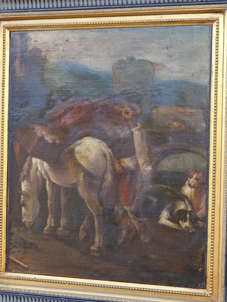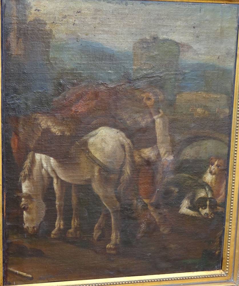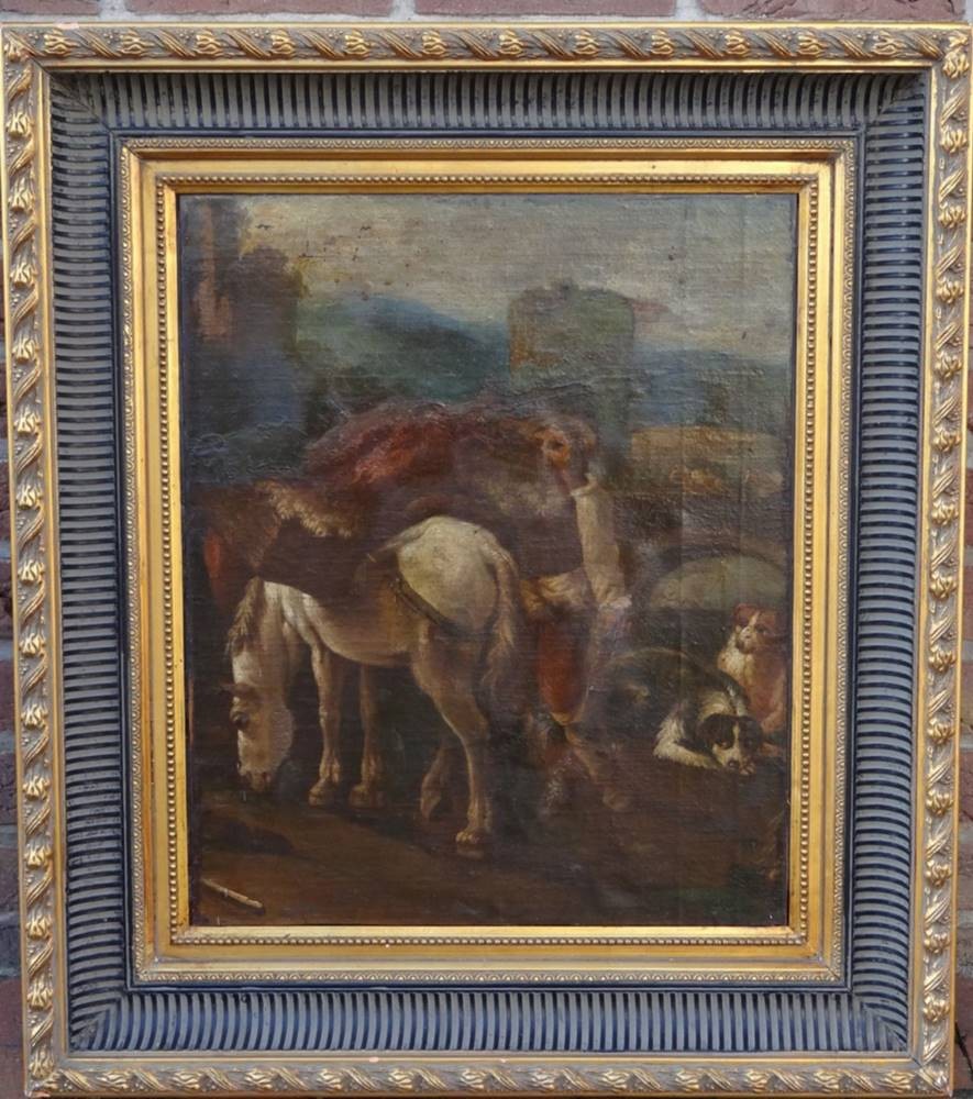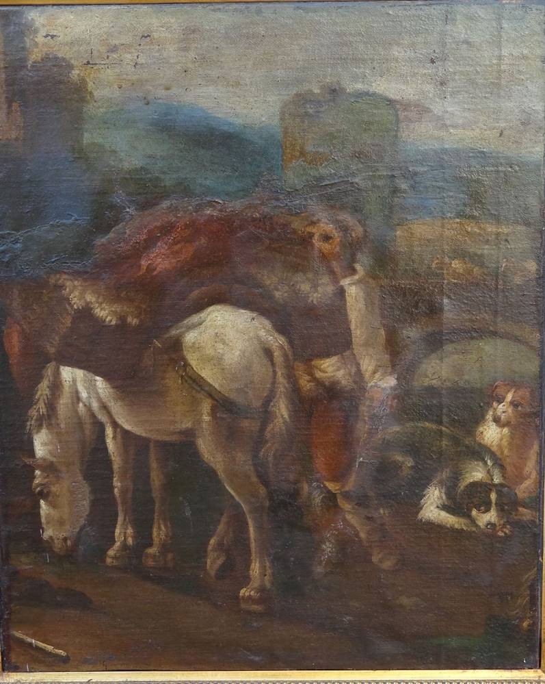 anonymer Altmeister "beladenes Pferd und Hunde" wohl 18.Jhd., Öl/Leinen, doubliert, 66x55 cm, reinigungsbedürftig, gerahmt RG 84x74 cm, Sperrgut! [1]