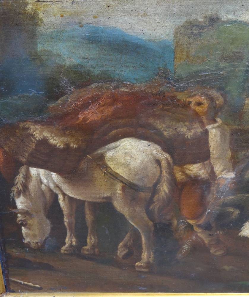 anonymer Altmeister "beladenes Pferd und Hunde" wohl 18.Jhd., Öl/Leinen, doubliert, 66x55 cm, reinigungsbedürftig, gerahmt RG 84x74 cm, Sperrgut!