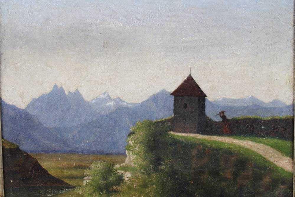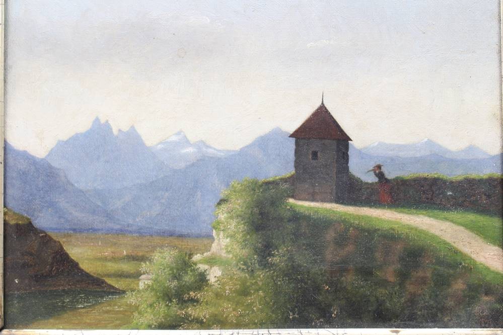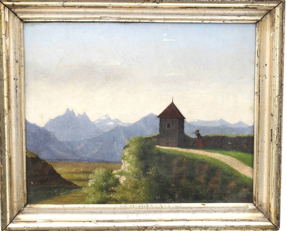 anonymer Altmeister, Berglandschaft mit Turm, um 1850, Öl/Leinen, gerahmt, RG 26x32 cm [1]