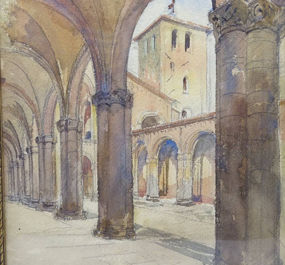 anonymes Aquarell "Mailand Sampbrogio" beschriftet, BG 26x32,5 cm, ger/Glas, verso Skizze des Museums Sant’Ambrogio und Stempel "Paul Bruckmann, Architekt, Cöln" (Kirche geweiht 379 n. Chr.) [1]