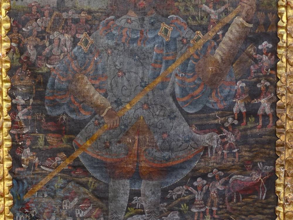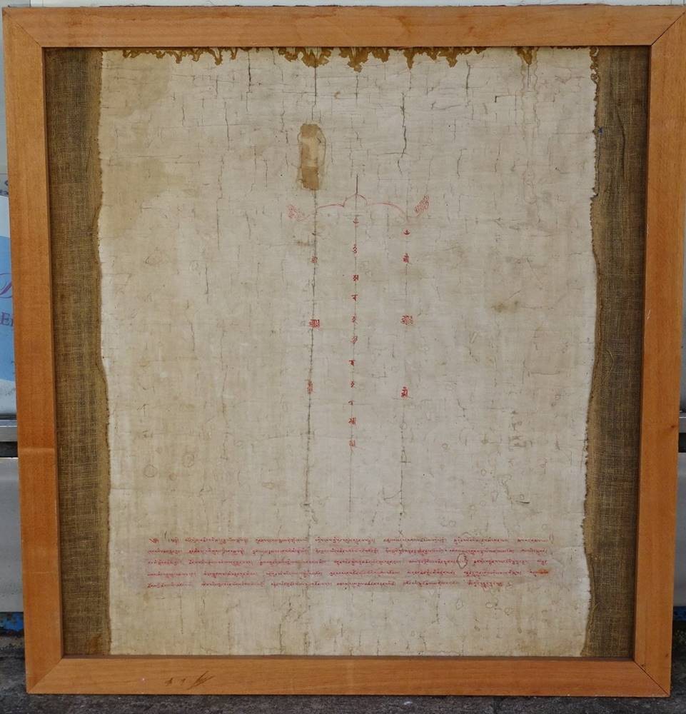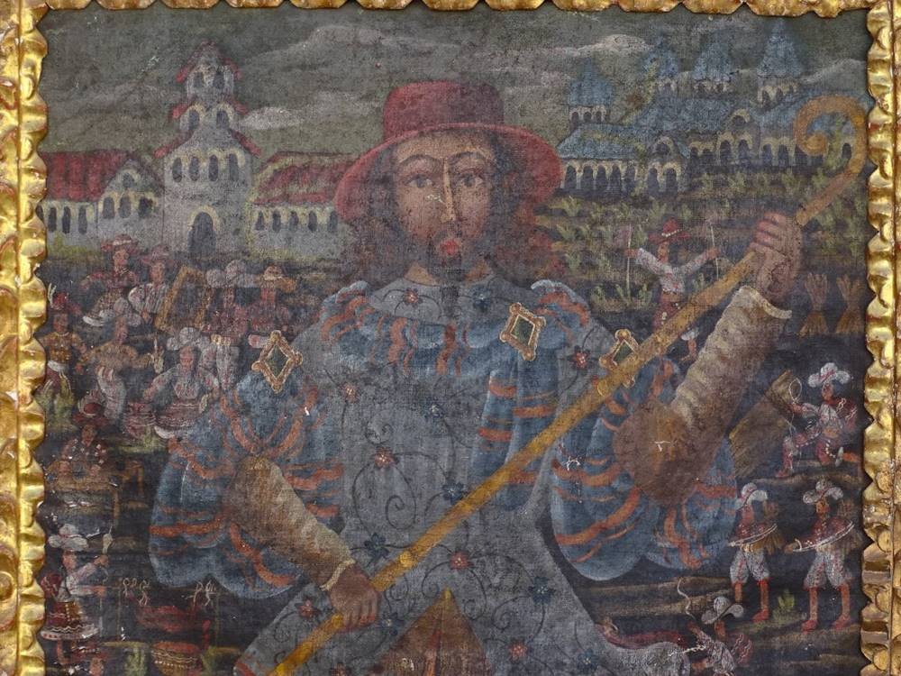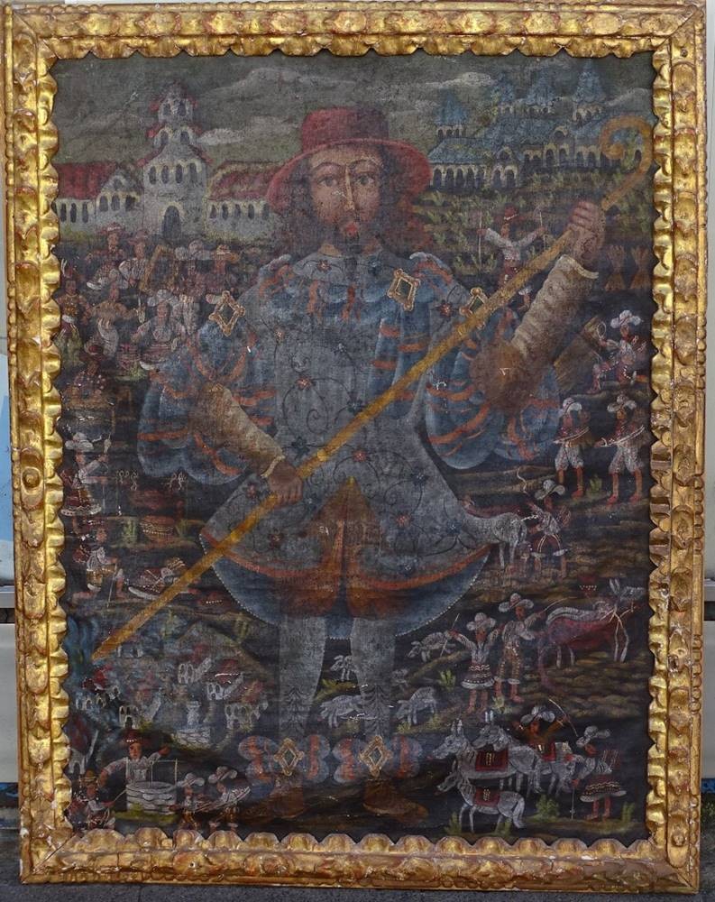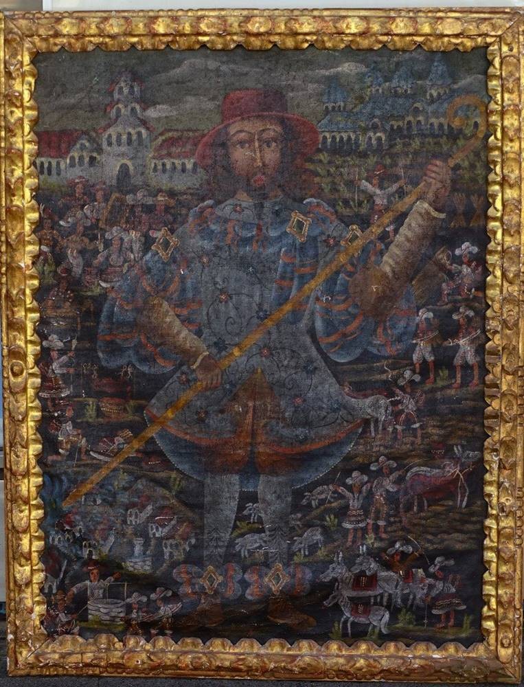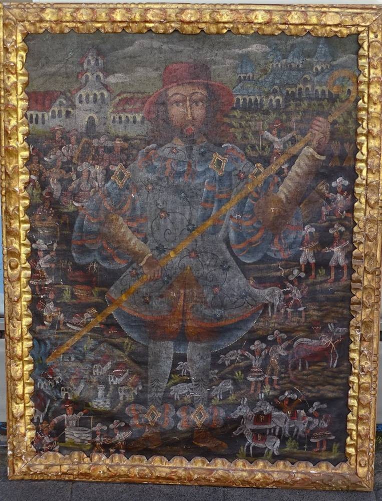 anonymes grosses Gemälde, Portrait eines Kriegers vor Stadtsilhouette, wohl Zentralasien? Öl/Leinen, kl. Löcher etc, restaurierungsbedürftig, Alters-u. Gebrauchsspuren, gerahmt, Holz hinterlegt. Leinwand müsste neu gespannt werden, verso beschriftet, RG 110x86 cm, (Sperrgut, ca. 36 € BRD)