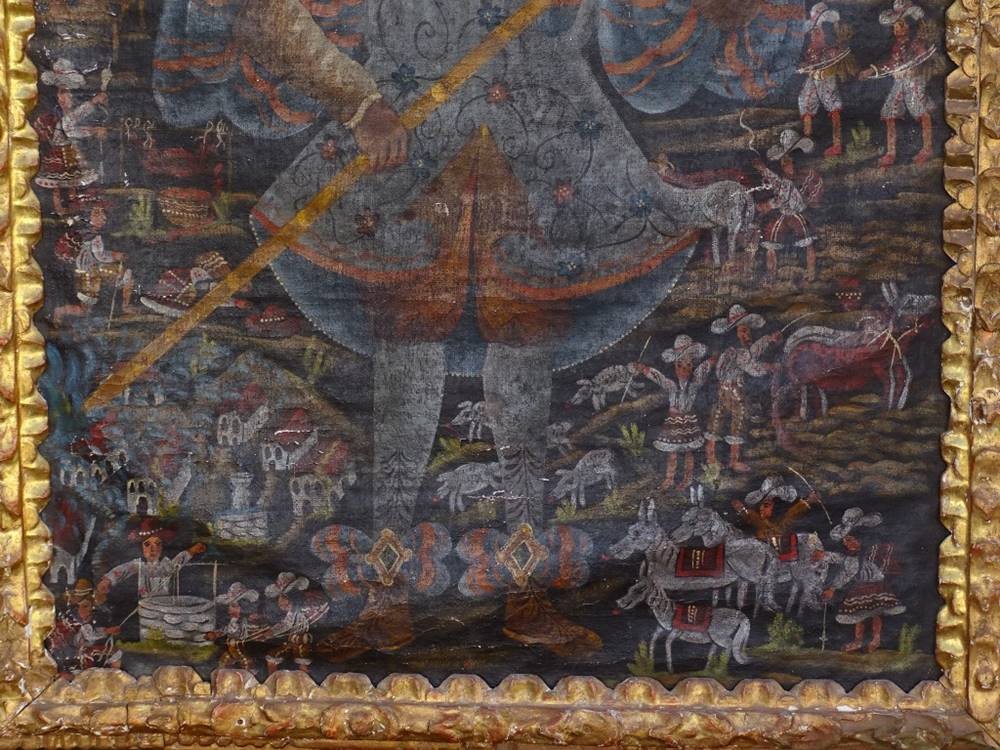 anonymes grosses Gemälde, Portrait eines Kriegers vor Stadtsilhouette, wohl Zentralasien? Öl/Leinen, kl. Löcher etc, restaurierungsbedürftig, Alters-u. Gebrauchsspuren, gerahmt, Holz hinterlegt. Leinwand müsste neu gespannt werden, verso beschriftet, RG 110x86 cm, (Sperrgut, ca. 36 € BRD) [1]