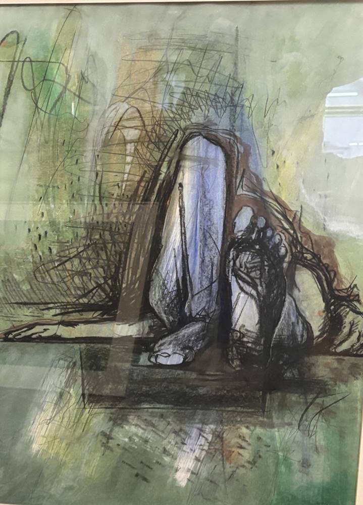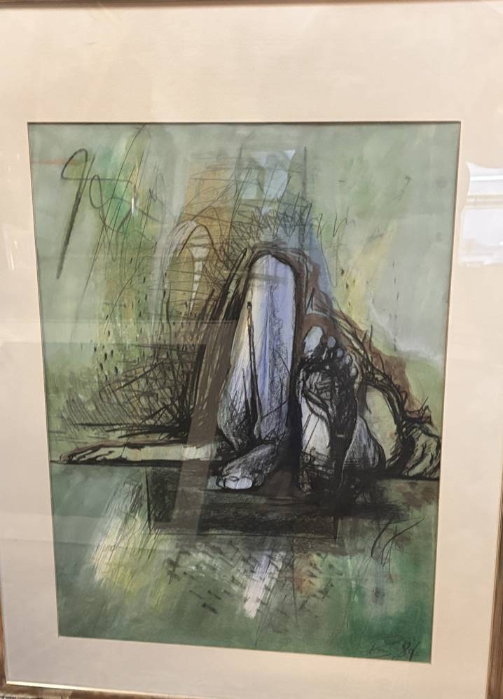 B. (19)87 "Liegende" Mischtechnik, ger/Glas, RG 92x47 cm, rückseitig Etikette der Galerie M, Hamburg