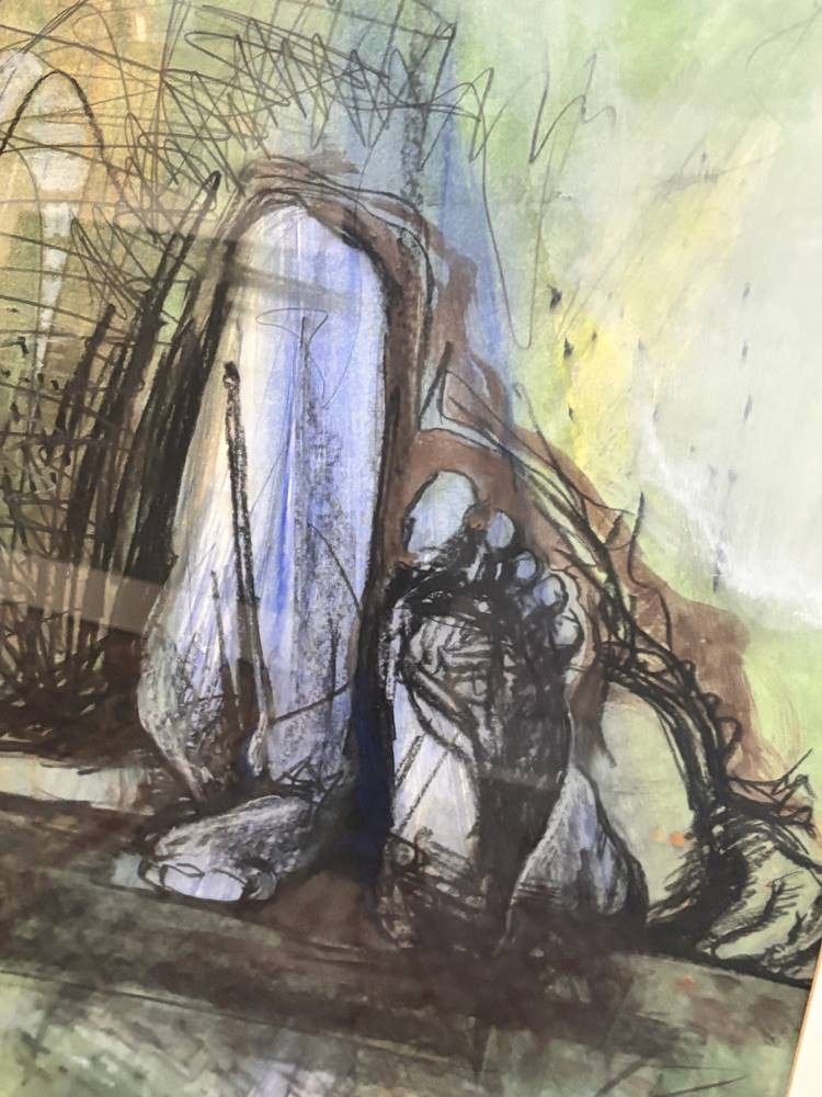 B. (19)87 "Liegende" Mischtechnik, ger/Glas, RG 92x47 cm, rückseitig Etikette der Galerie M, Hamburg [1]