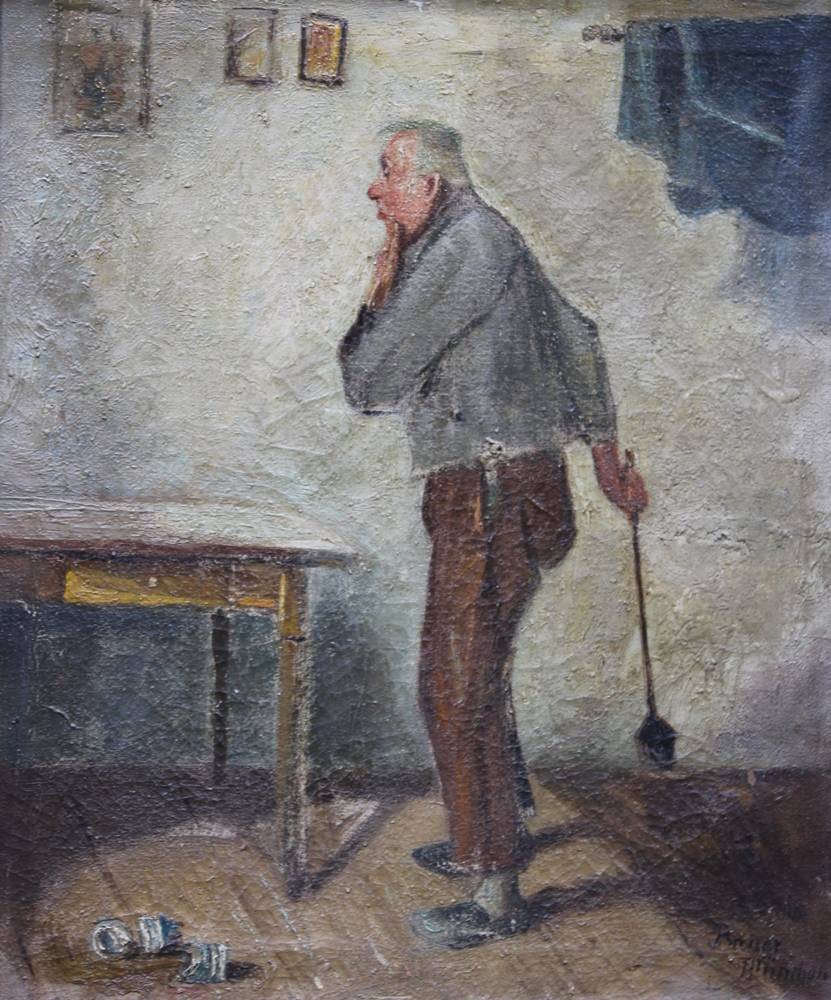 Bauer, München, Die Fliegenjagd, wohl Kopie nach Wilh. Frey, Öl/Leinwand, alt gerahmt, RG 37,5 x 32cm, verso hinterlegte Stellen [1]
