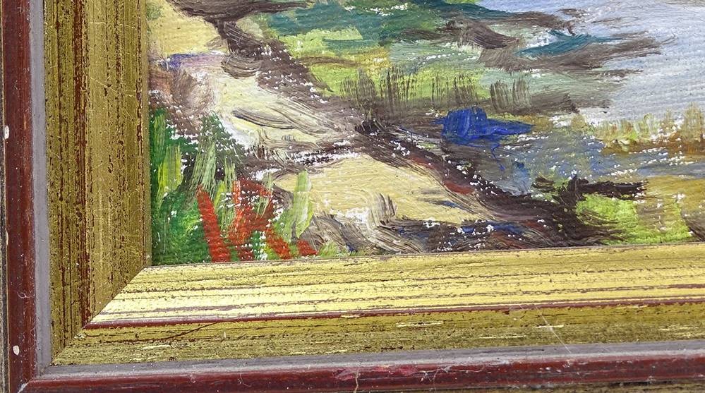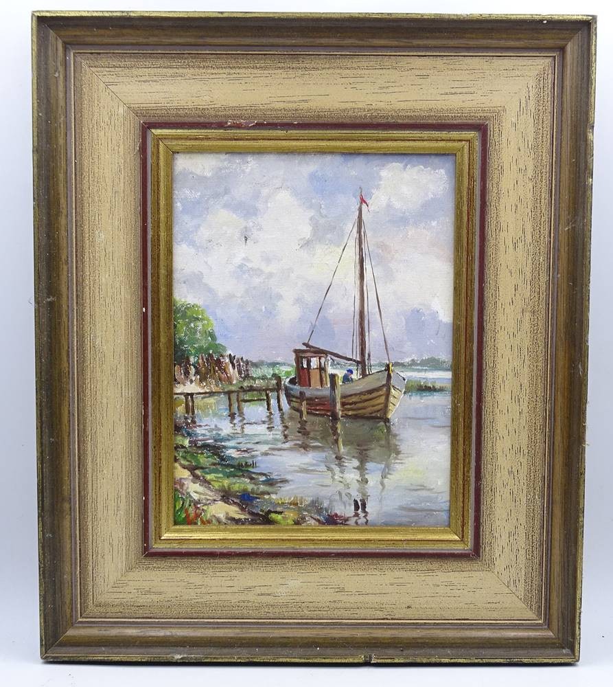 "Boot am Steg", Monogrammiert HR?, gerahmt, Öl/Malfaser, RG 26,5x31cm [1]