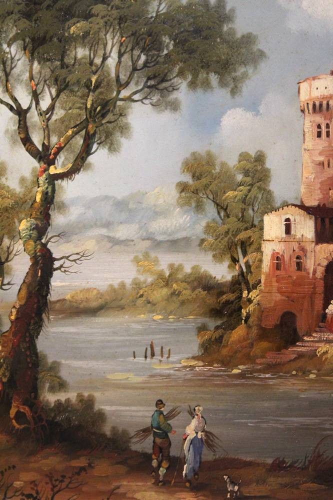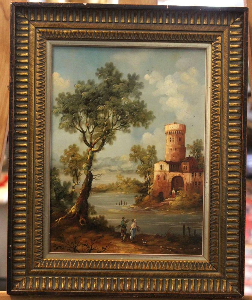 Deyer, wohl Jan DEYER (XIX-XX), Landschaft mit Personen und Burg, Öl/Kupferplatte, gerahmt, RG 32,5 x 26,5cm. [1]