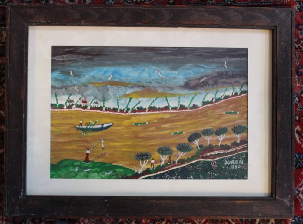 Dino Daolio Duren (1917-1983), Il fiume po 1980, Naiv, Öl/Malkarton, ger./Glas, RG 39 x 51cm [1]