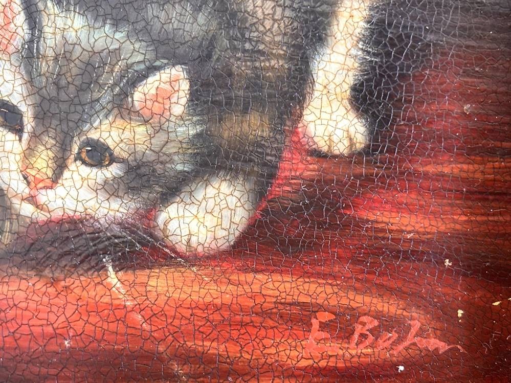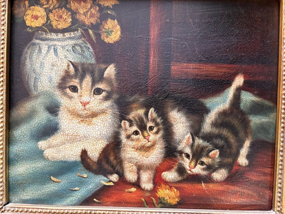 Emil BOEHM (1873-1958) "drei Kätzchen" Öl/Holz, gut gerahmt, RG 26x31 cm, re. unten in rot signiert [1]