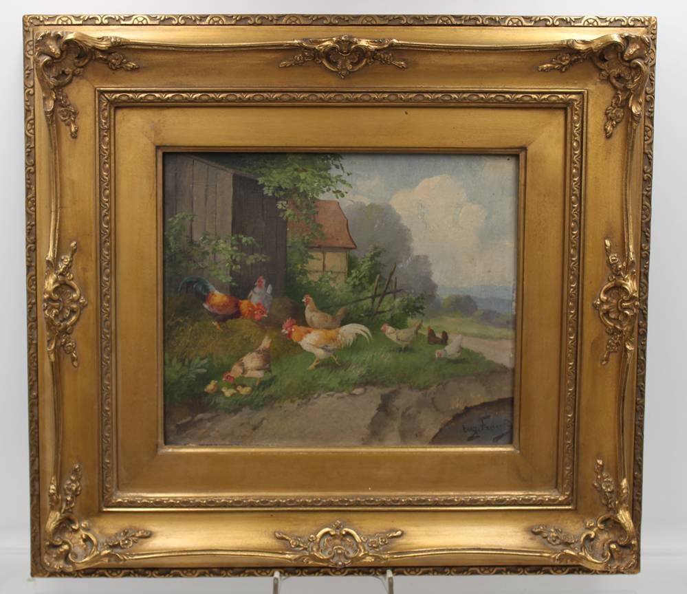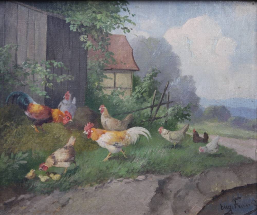Eugen FRANK-COLON (XIX-XX), Hühner, Öl/Hartfaser, gerahmt, RG 38 x 42,5cm [1]