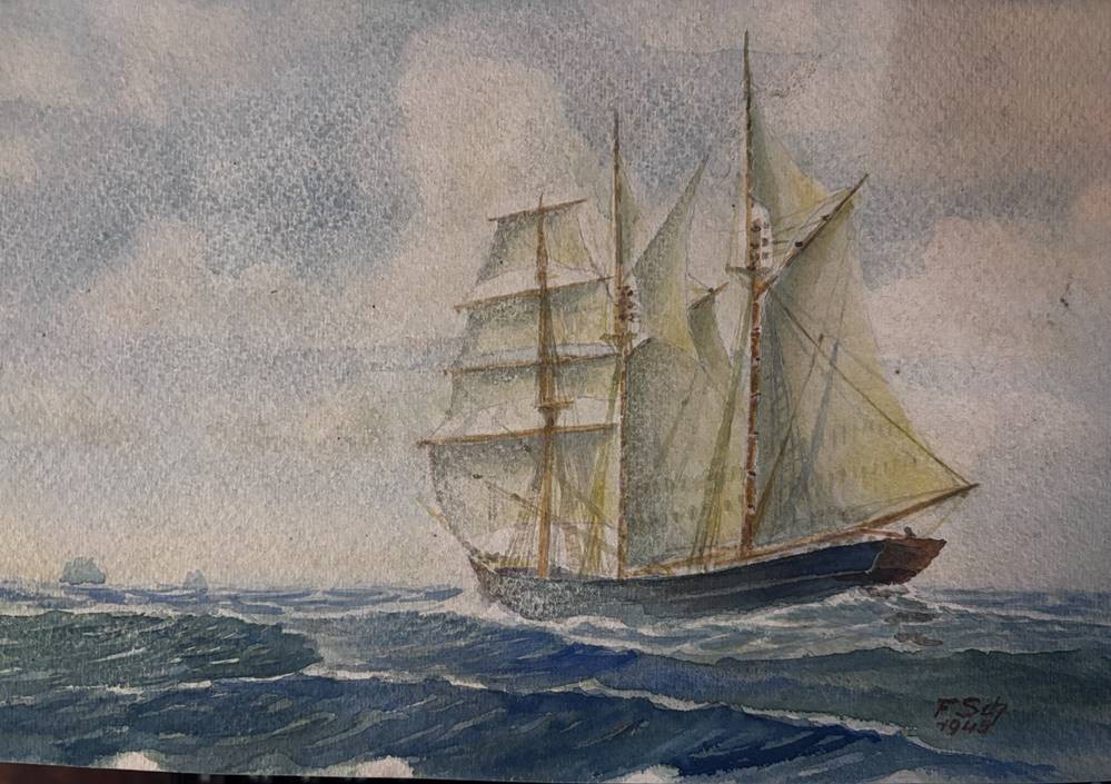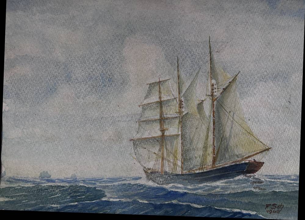 F. Sch. 1945 "Segelschiff auf See", Aquarell/Papier, 19x26 cm