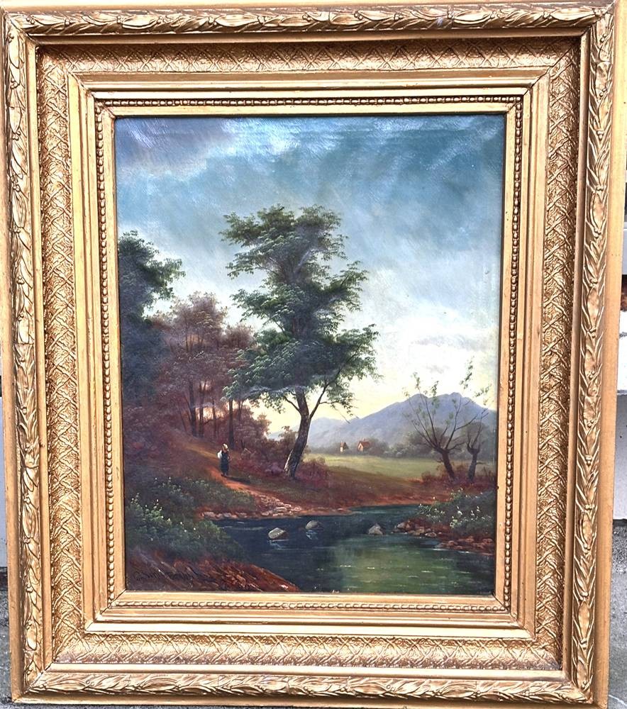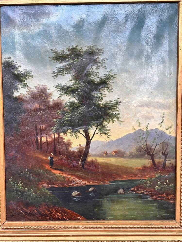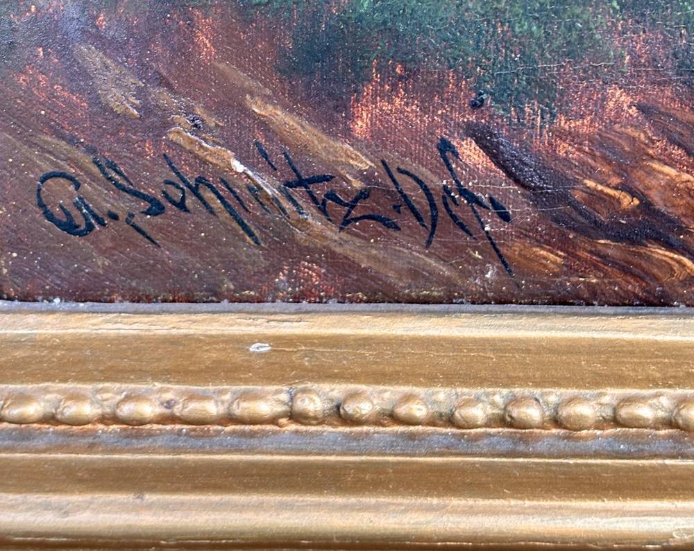 G. Schmitz, Ddf (oder ähnlich) "Landschaft am Bach" Öl/Leinen, breiter Goldrahmen, 75x60 cm [1]