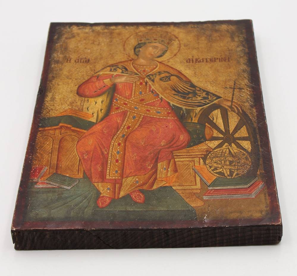 griech. Ikone, Heilige Katharina von Alexandrien, 1. Hälfte 20. Jhd., verso Beschreibung, 33,5 x 24,5cm.