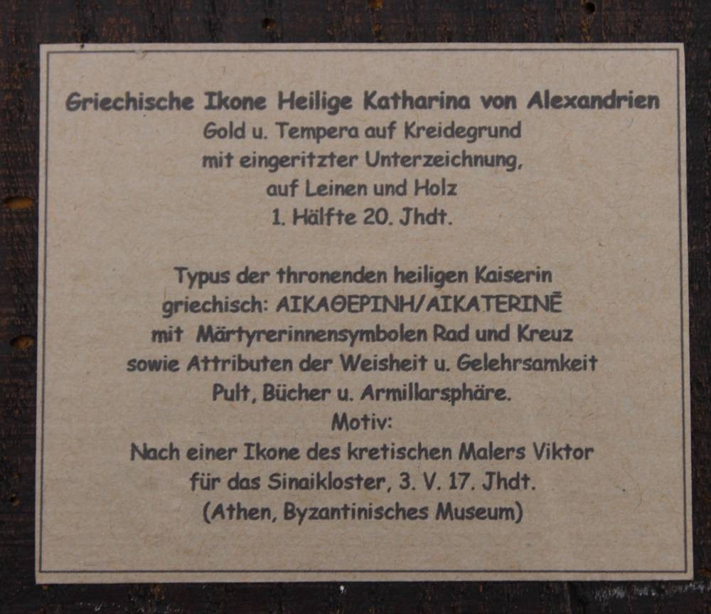 griech. Ikone, Heilige Katharina von Alexandrien, 1. Hälfte 20. Jhd., verso Beschreibung, 33,5 x 24,5cm. [1]