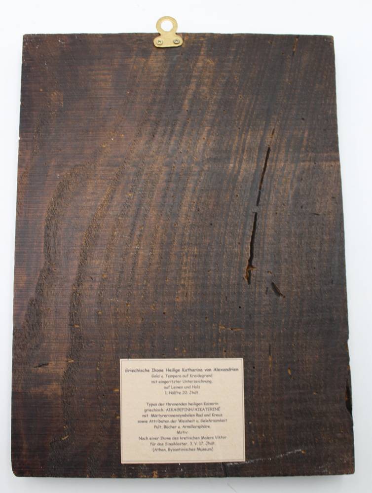 griech. Ikone, Heilige Katharina von Alexandrien, 1. Hälfte 20. Jhd., verso Beschreibung, 33,5 x 24,5cm. [1]