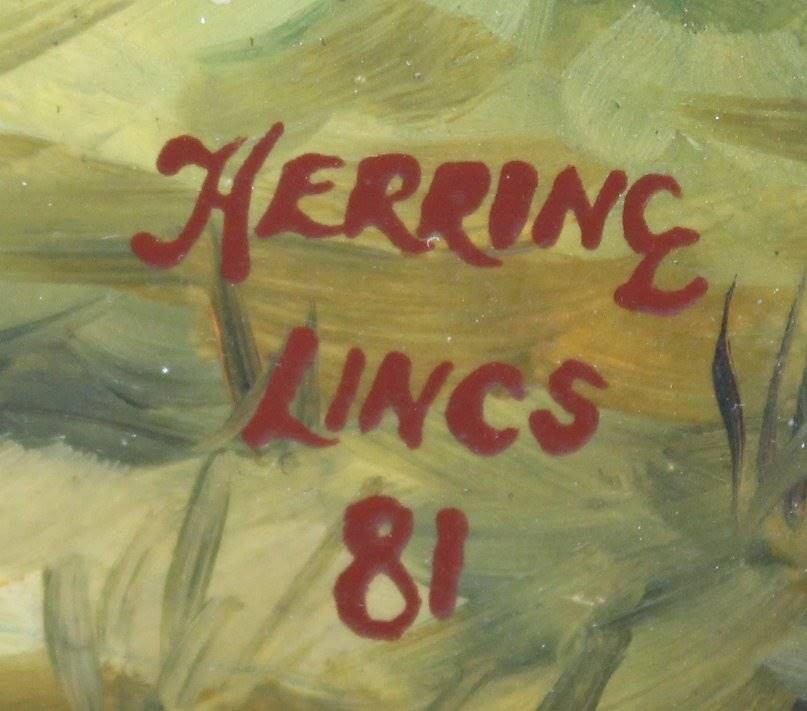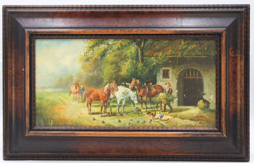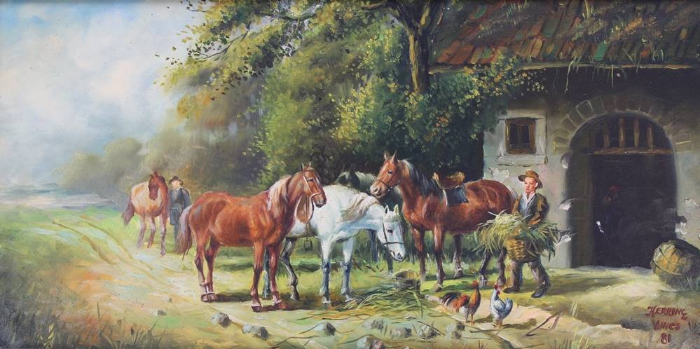 Herrine Lincs '81, vor dem Pferdestall, Öl/Holz, gerahmt, RG 34 x 54,5cm [1]