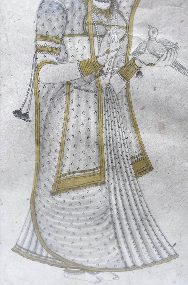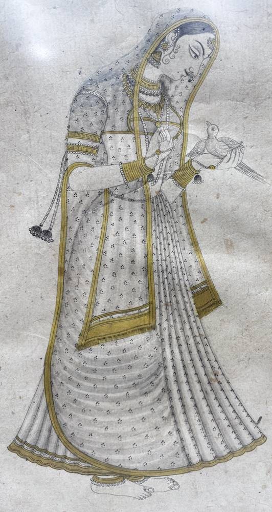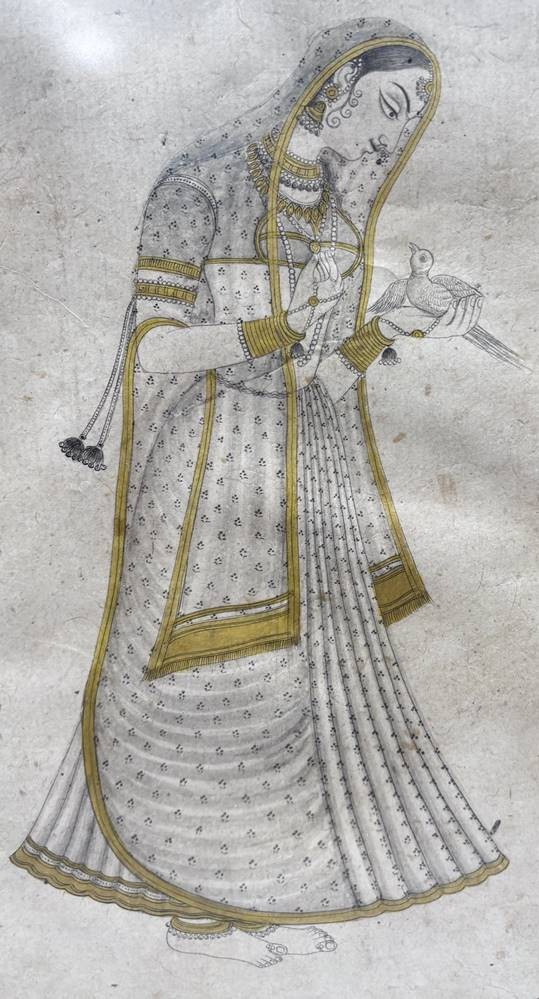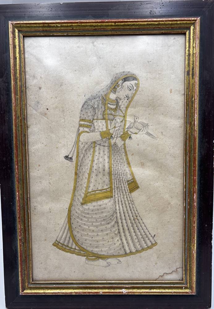indisches Aquarell , Frau mit Vogel, Blatt mit Flecken, wasserrandig, ger/Glas , RG 40x28cm,Alter? [1]