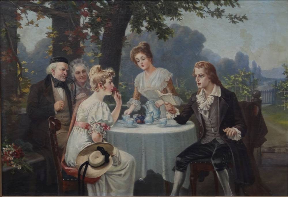 Jon POPP (1862-1953) "Gartengesellschaft", Öl/Leinen, gerahmt, RG 68 x 93 cm, Sperrgut!