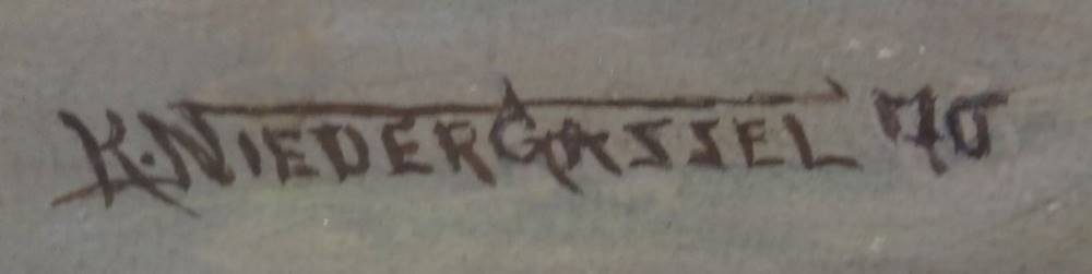 K. Niedergassel "Trommler zu Pferde", Mischtechnik, ger/Glas, RG 31x 25,5 cm [1]