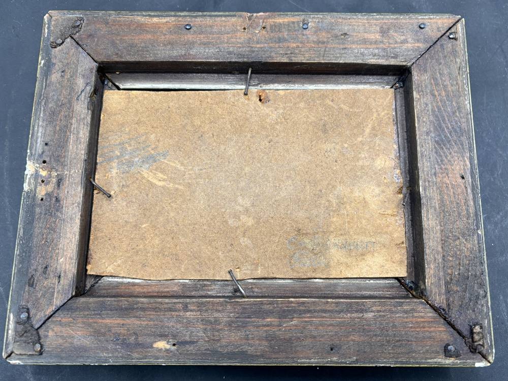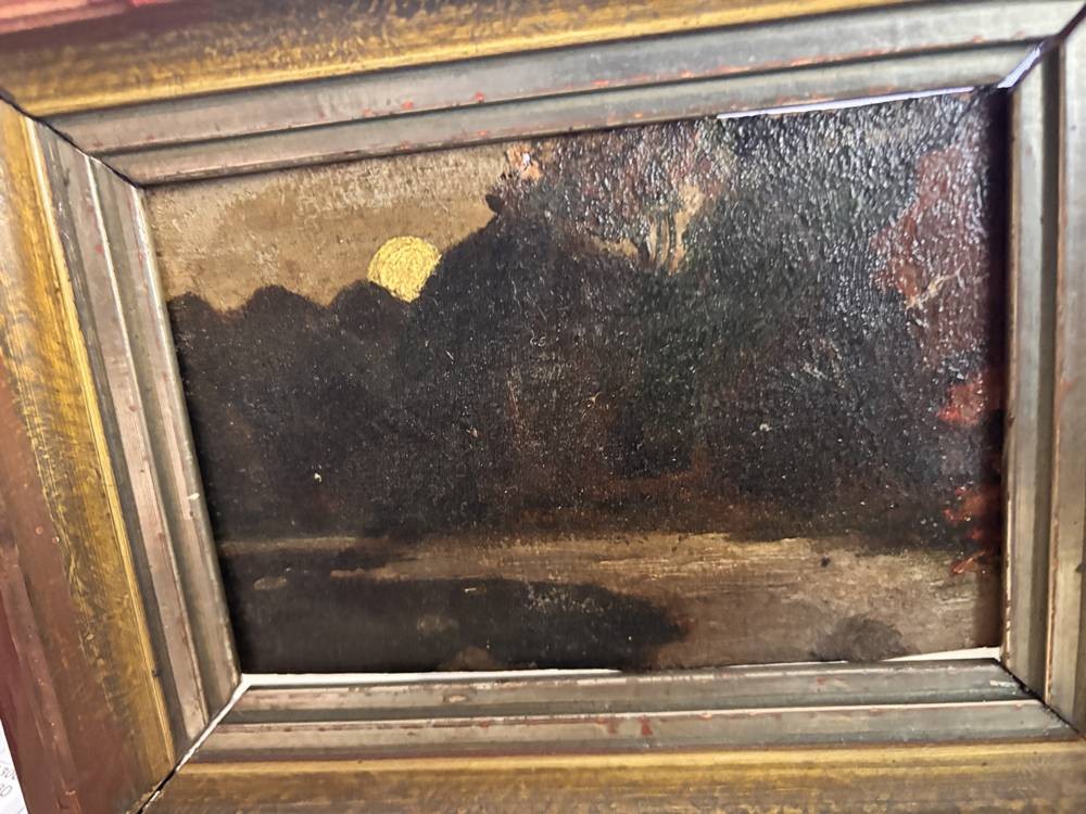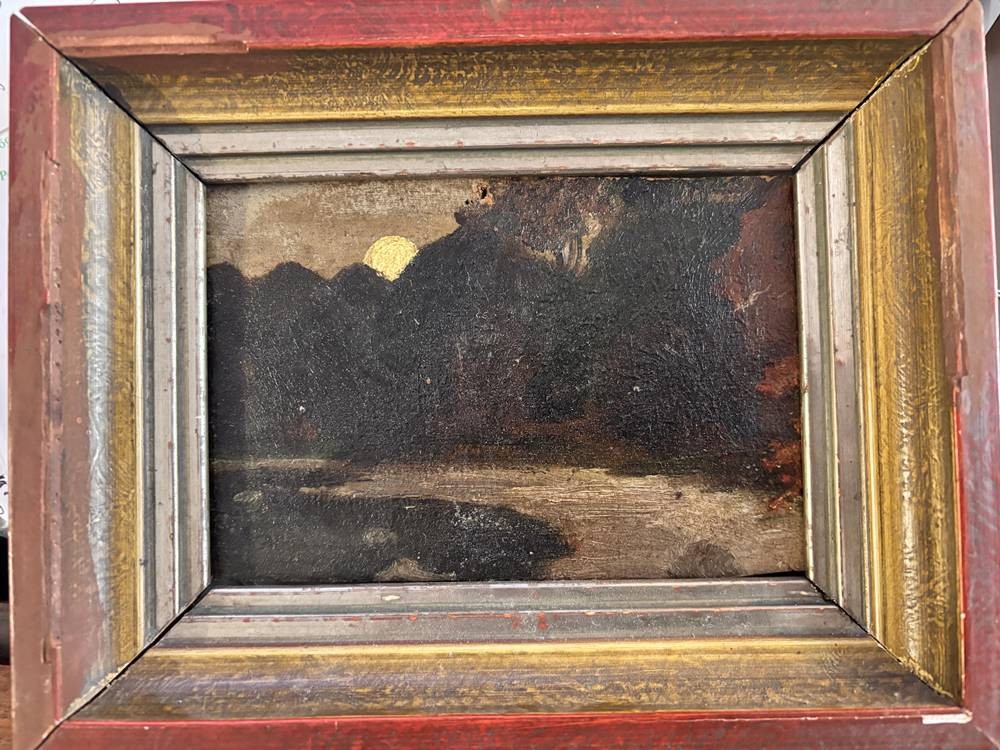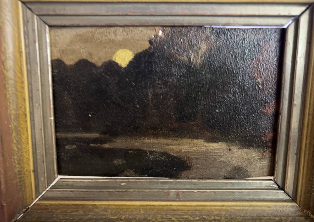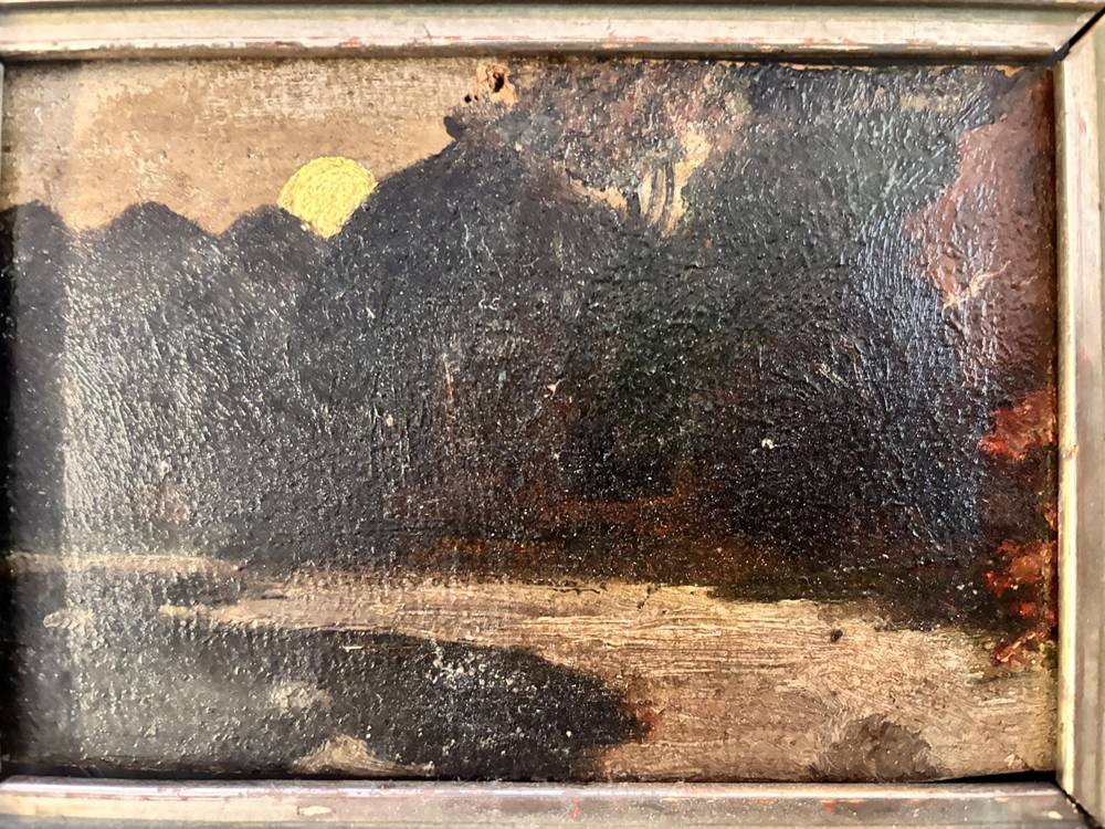 kl. anonymes Gemälde, Mond über dkl. Wald, auf Pappe, alt gerahmt, RG 17x21 cm [1]