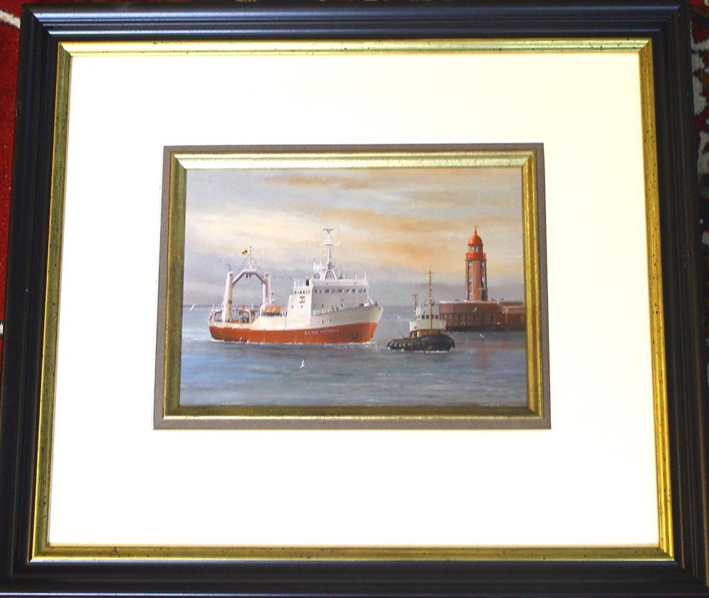 Klaus Roskamp (1941) "Fischtrawler Geestemünde vor Mole", Öl/Platte Motiv 19x25 cm, gut gerahmt, RG 40x45 cm [1]