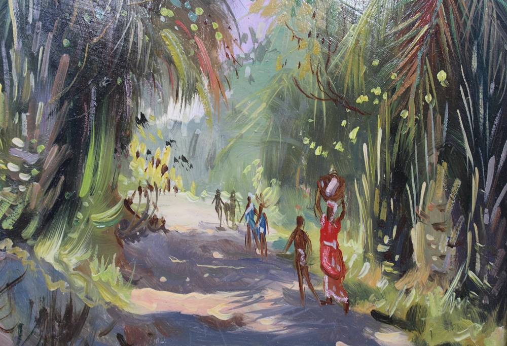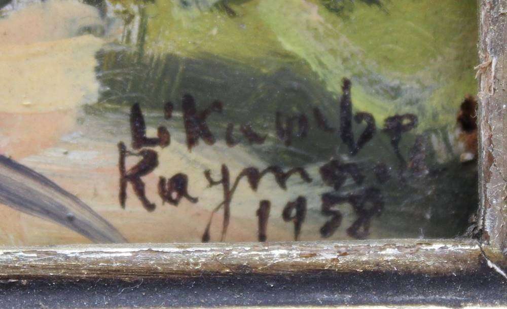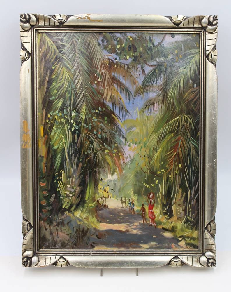 Li Kmabe Raymond o.ä., 1958, wohl afrik. Urwald, Öl/Leinwand, restau.bedürftig, gerahmt, RG 45 x 35cm, Rahmen beschädigt [1]