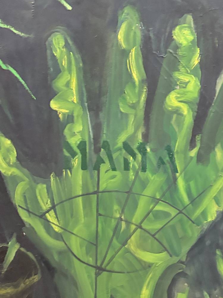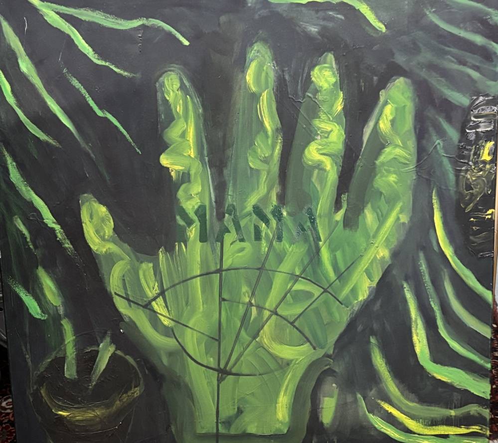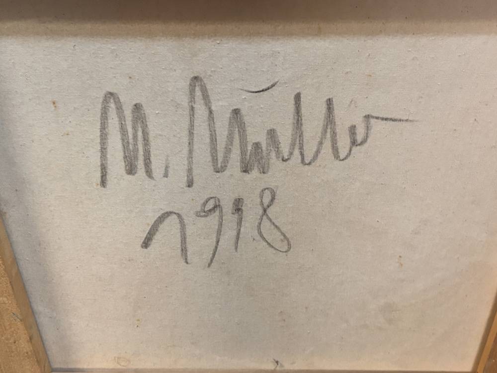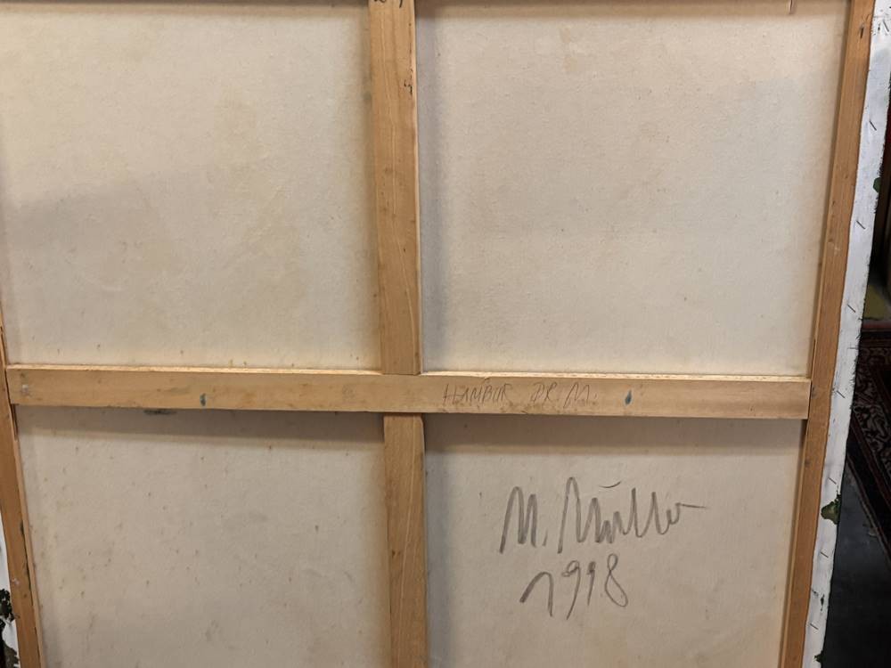 M. Müller "grüne Hand" Mama beschriftet, Öl/Leinen, verso signiert, kl. Riss li.oben, 100x100 cm, Sperrgut [1]