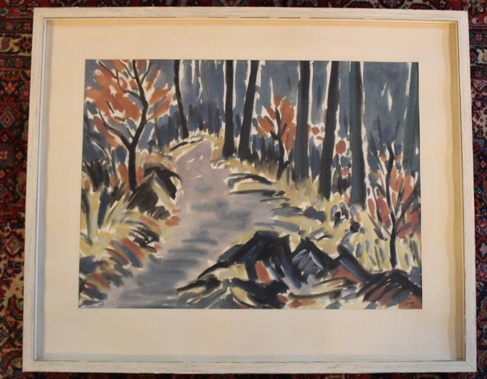 monogrammierter Waldweg, Aquarell, gerahmt/Glas, RG 61 x 74,5cm