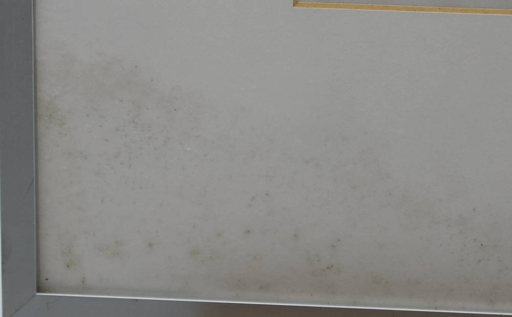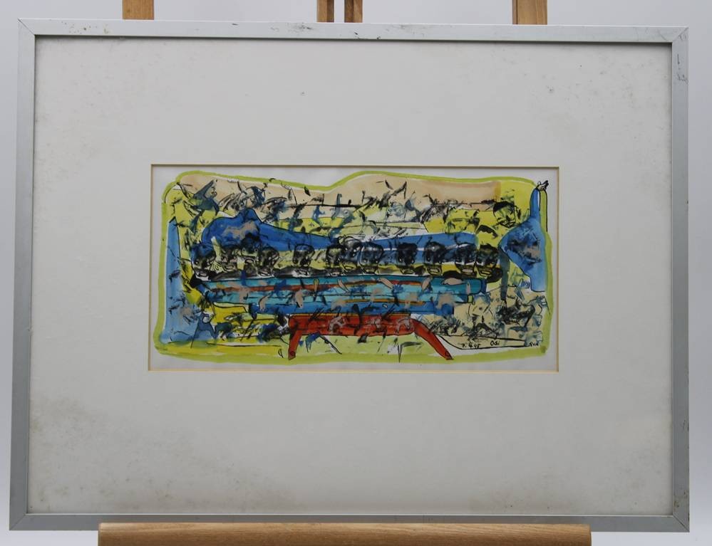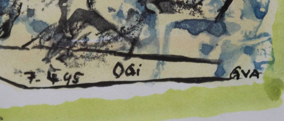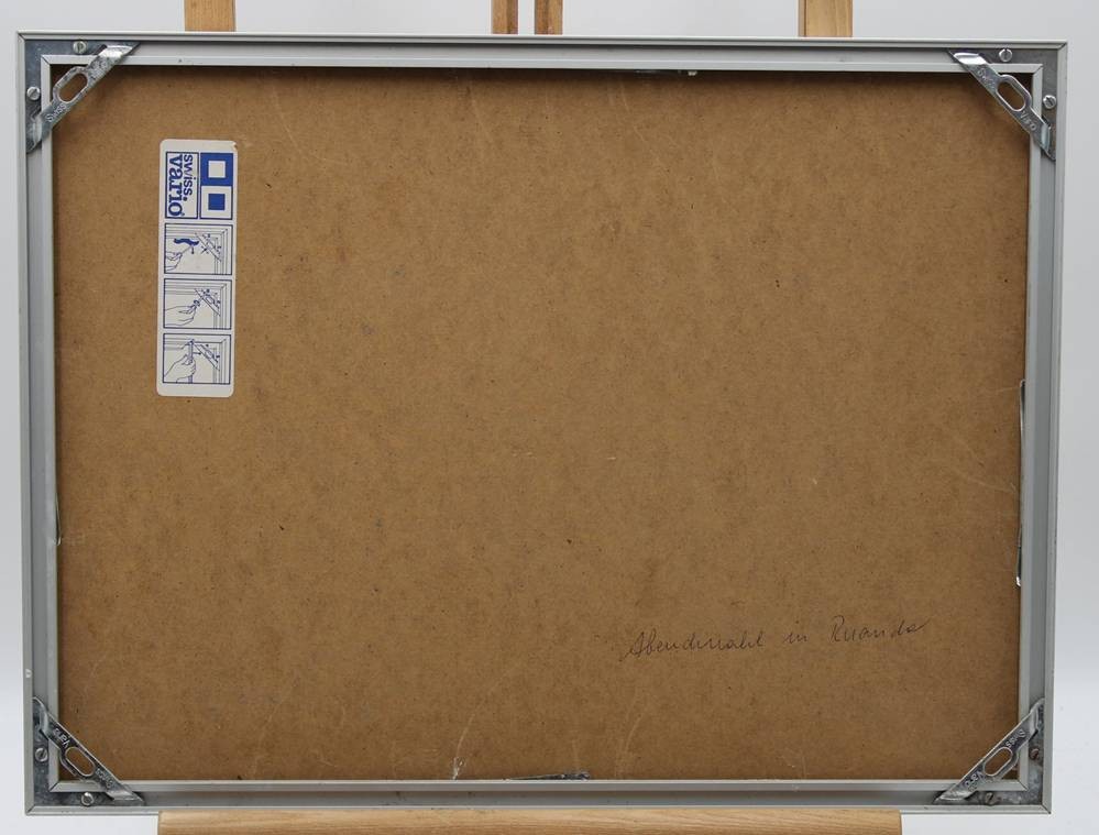 monogrammiertes Aquarell, betitelt "Abendmahl in Ruanda", datiert `95, gerahmt/Glas, RG 30,5 x 40,5cm, Mg 12,5 x 24,5cm, Passepartout stockfleckig [1]
