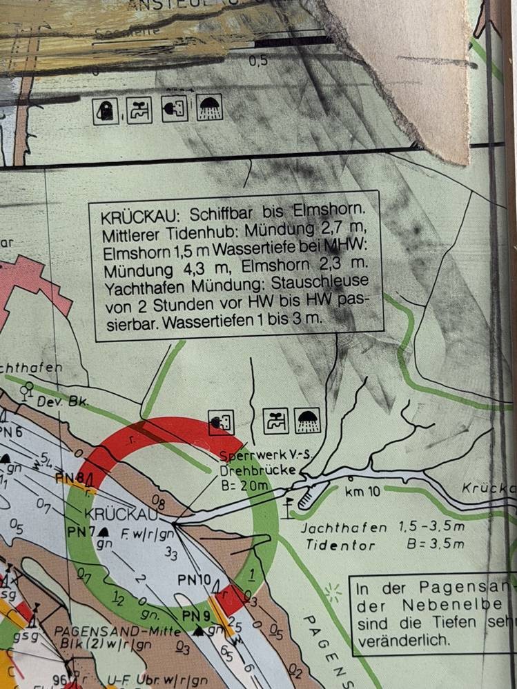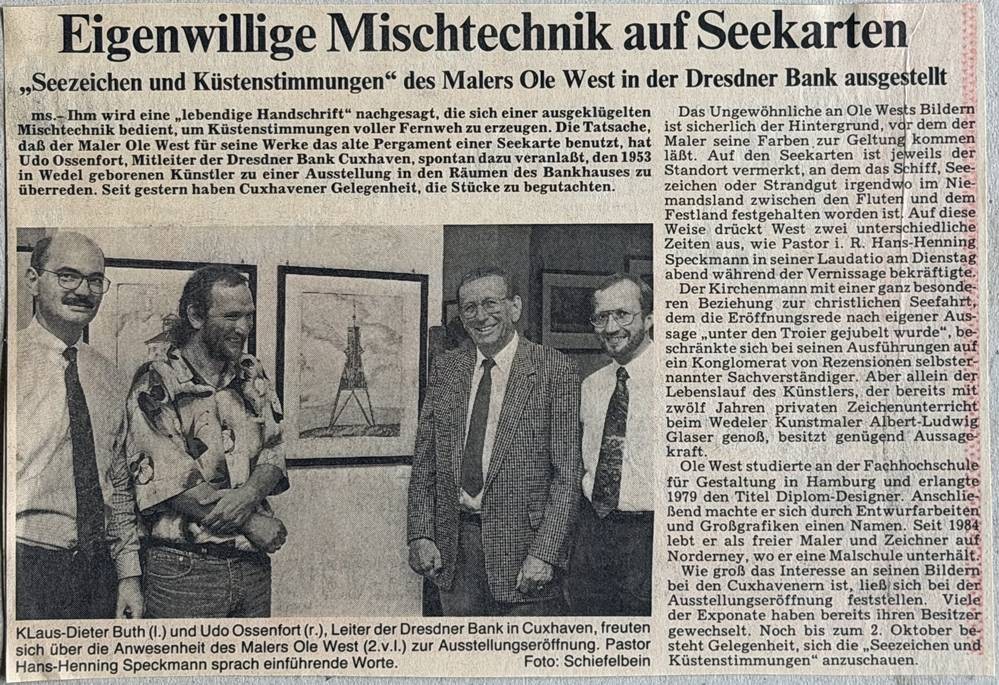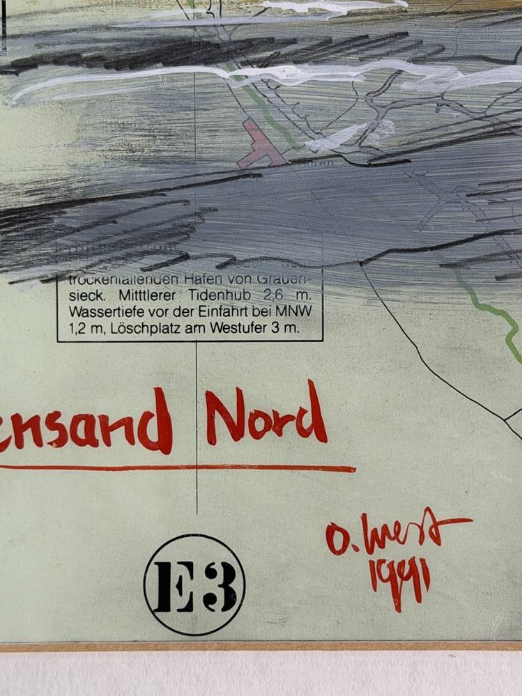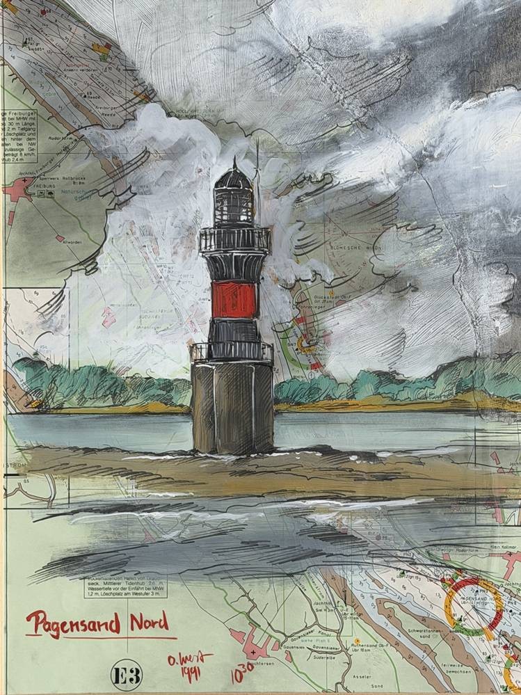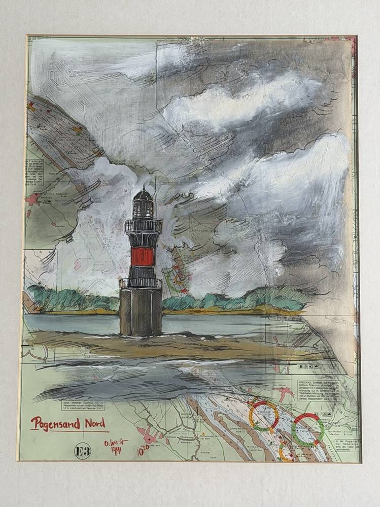 Ole WEST (1953) 1991 "Leuchtturm Pagensand" Aquarell, signiert, auf Seekarte, gerahmt/Glas, verso Zeitungsausschnitt, 65x54 cm [1]