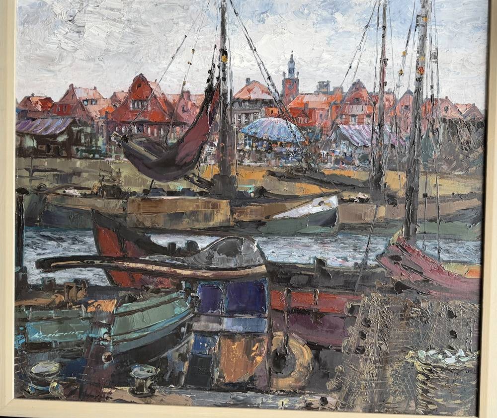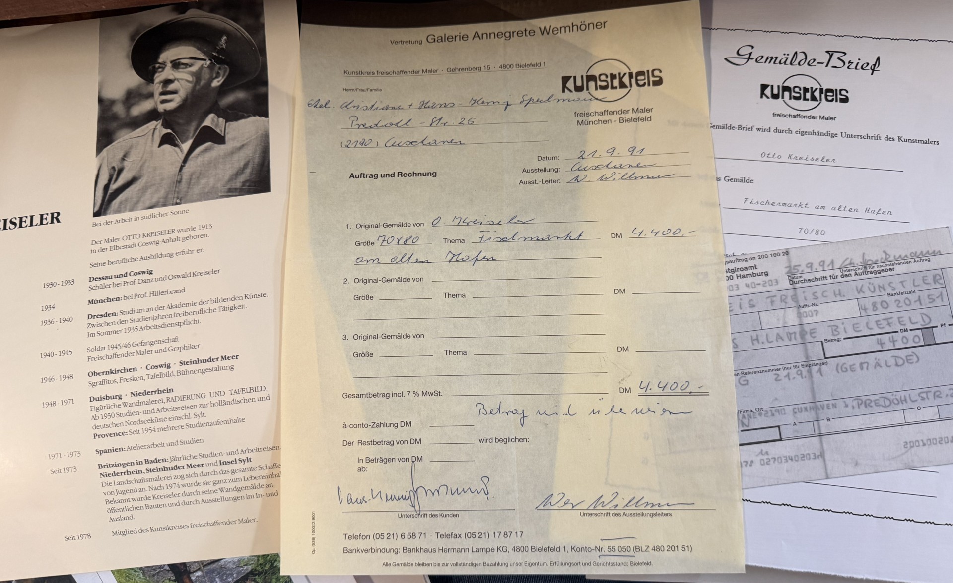 Otto Kreiseler (1913-1970) "Fischmarkt im alten Hafen" wohl Duisburg?, Öl/Leinen, gerahmt, RG 75x85 cm mit Rechnung (4400 DM, 1991) Künstlerbrief, Schriftverkehr [1]
