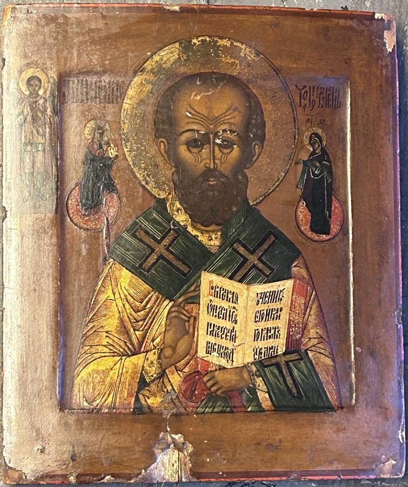 Russische Ikone "Hl. Nikolaus", 19.Jhd., restaurierungsbedürftig, 31x27 cm