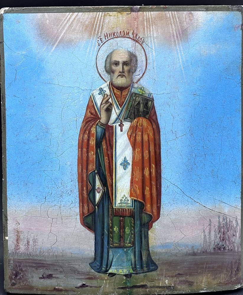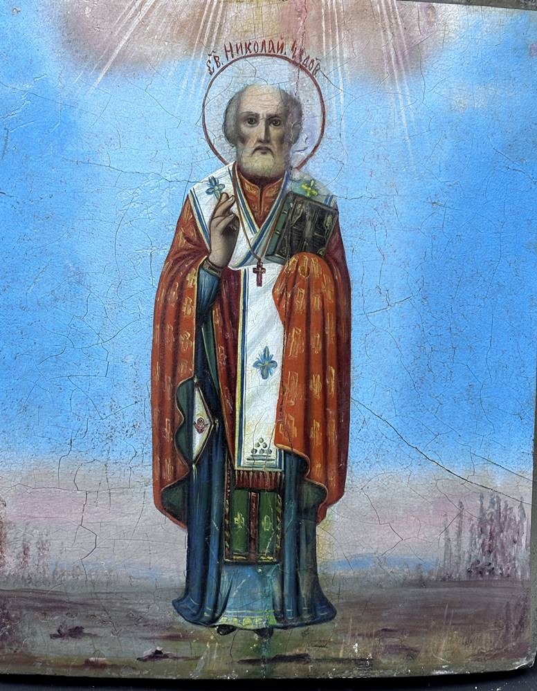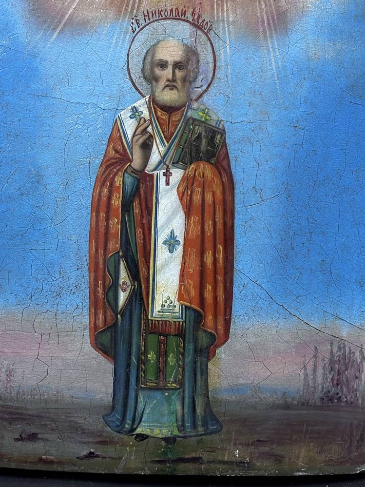 russische Ikone "Nikolaus der Wundertäter", auf gebogener Holzplatte,zweifach gesperrt, 31x27 cm