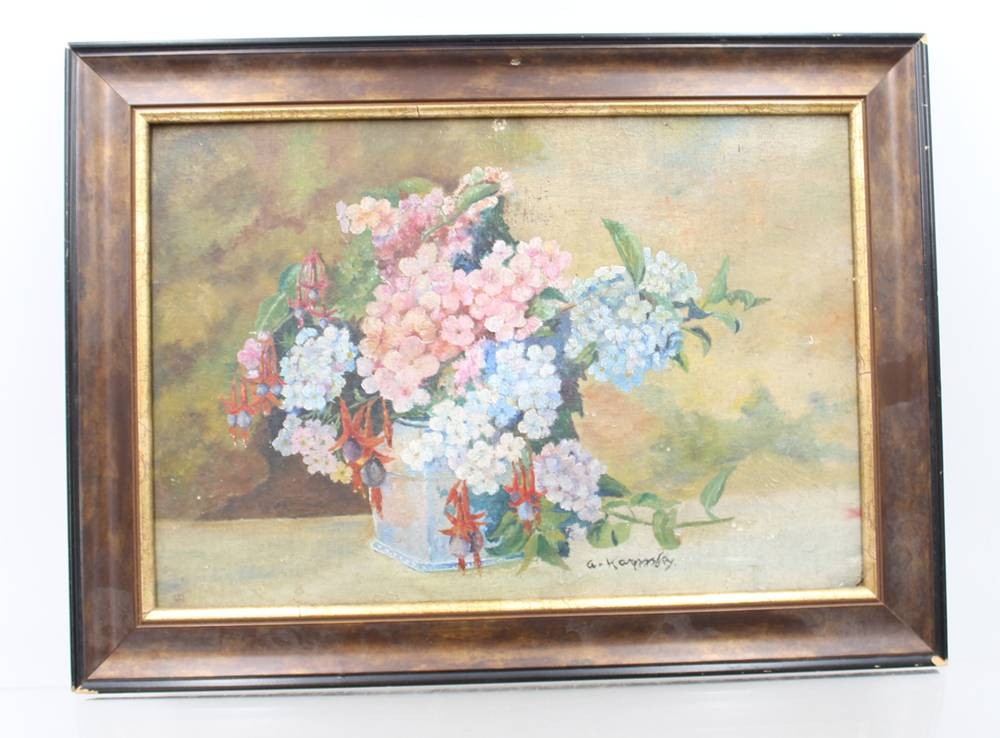signiert A.Karpinsky wohl Alfons KARPINSKI (1875-1961) , Blumenstilleben, leicht restau. bedürftig, Öl/Hartfaser, gerahmt, RG 28,5 x 38,5cm [1]