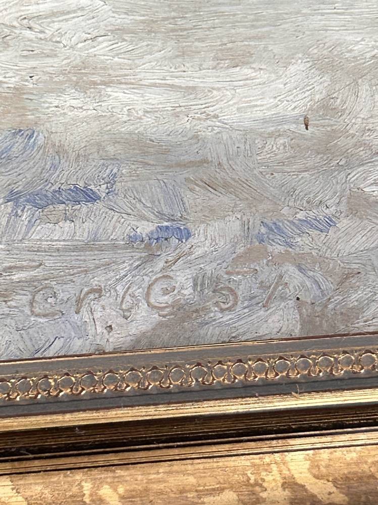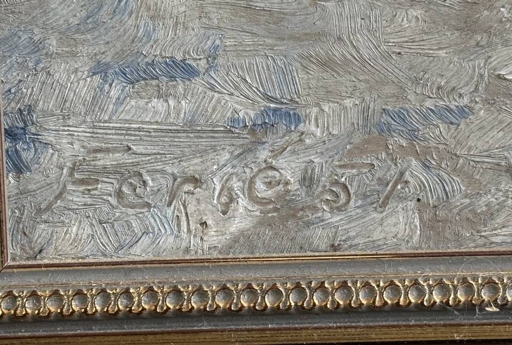 unleser. signiert, (19)54, "Zwei Männer im Schnee" Öl/Holz, gerahmt, RG 37x31 cm [1]