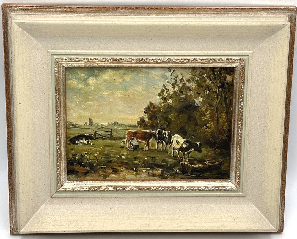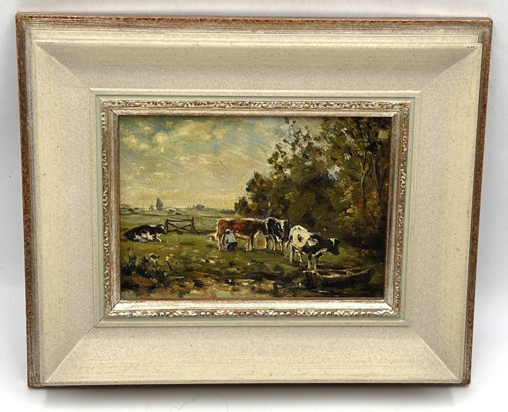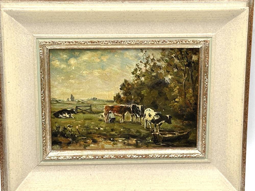 unleserl. sign. "Kühe auf der Weide" Öl/Platte, gerahmt, RG 26x21 cm