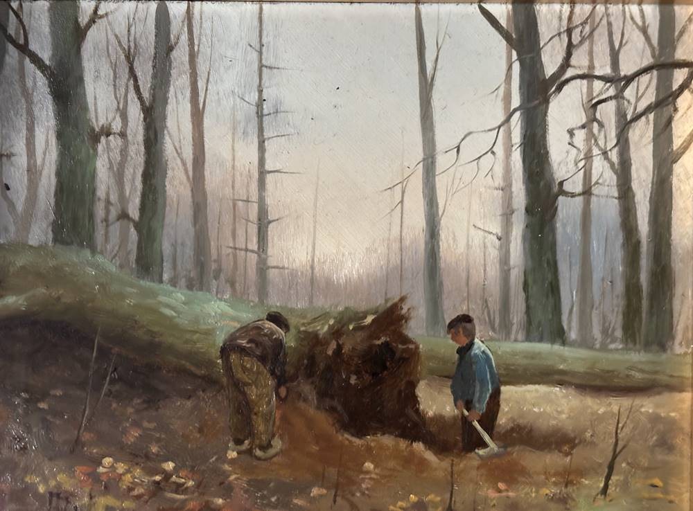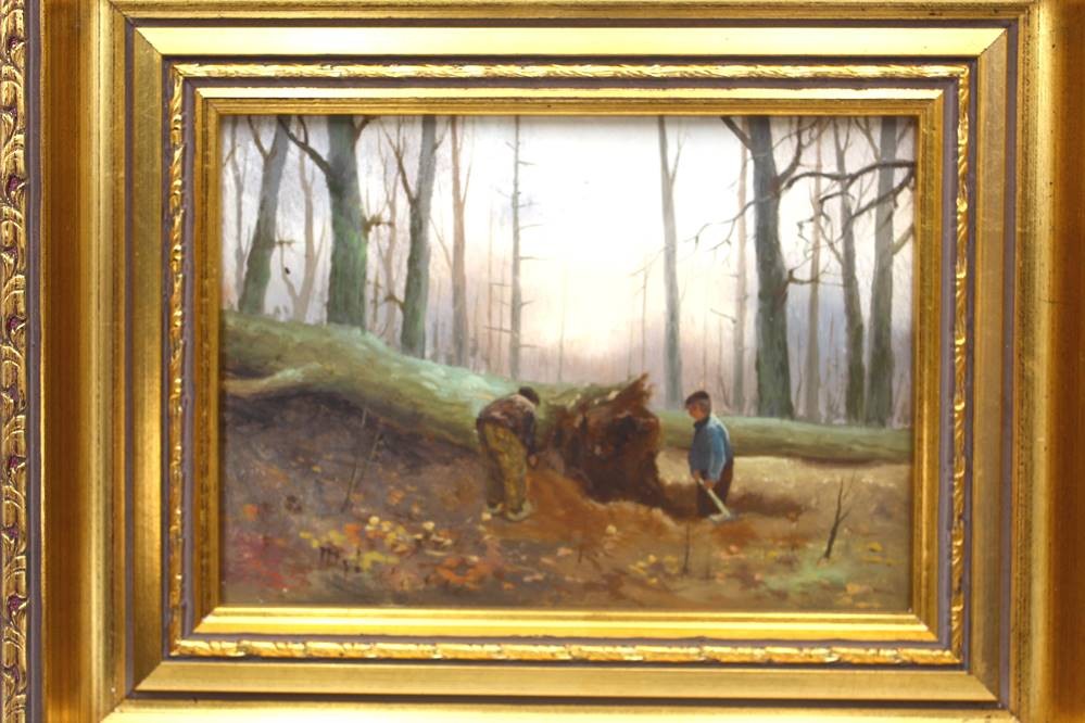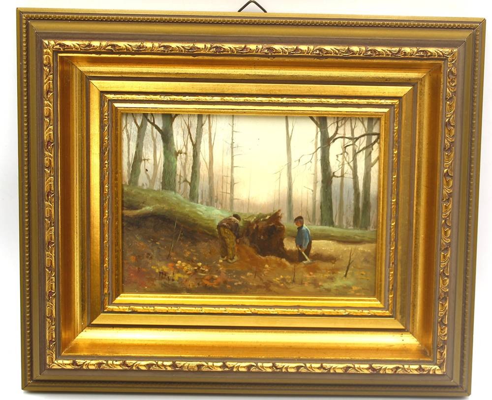 unleserl. sign. Ölgemälde "Waldarbeiter" auf Holz, gut gerahmt, RG 26x31 cm