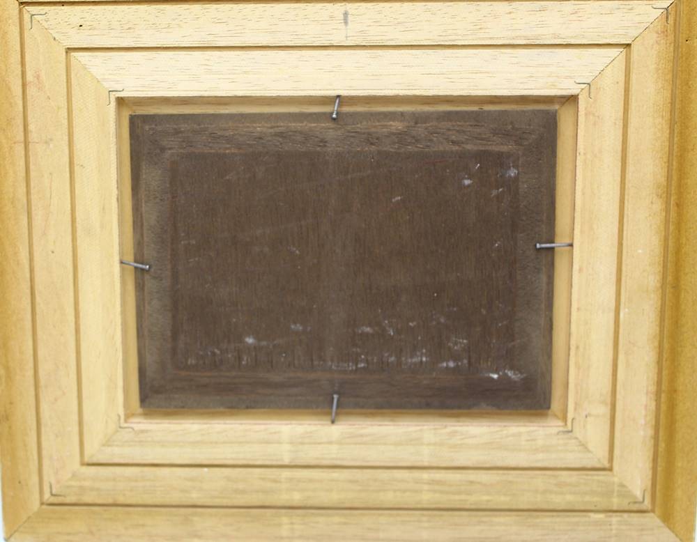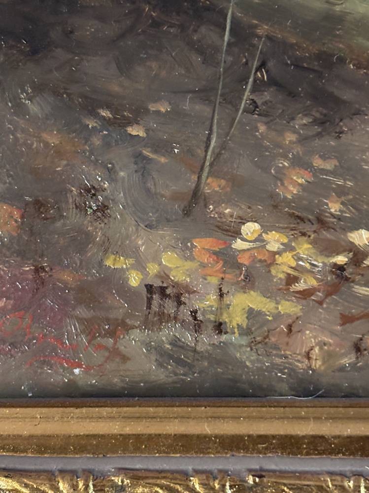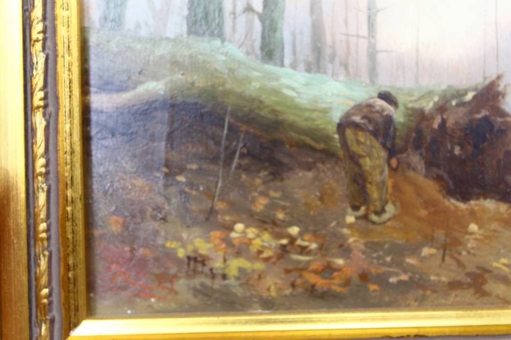unleserl. sign. Ölgemälde "Waldarbeiter" auf Holz, gut gerahmt, RG 26x31 cm [1]
