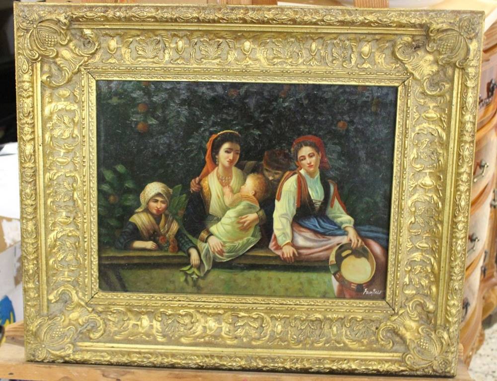 unleserl. signiert, 3 Frauen mit Kind, Italien ?, Öl/Holz, gut gerahmt, RG 48 x 58cm
