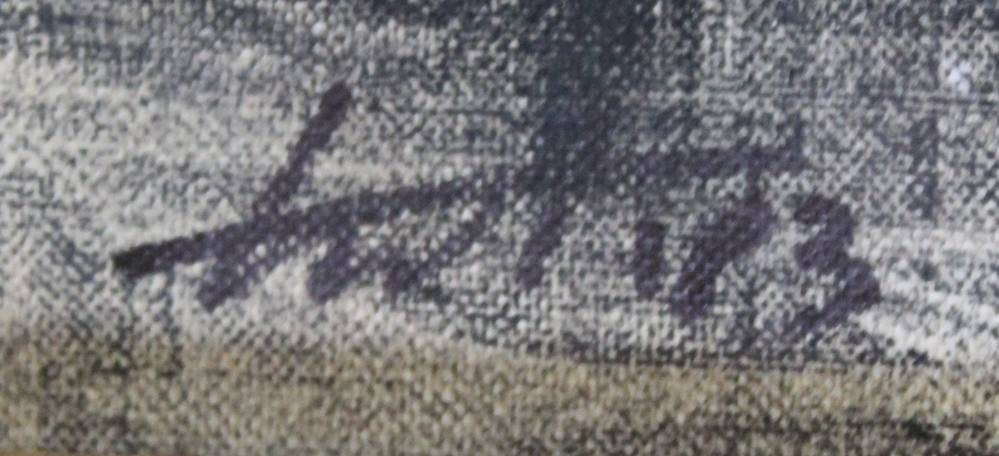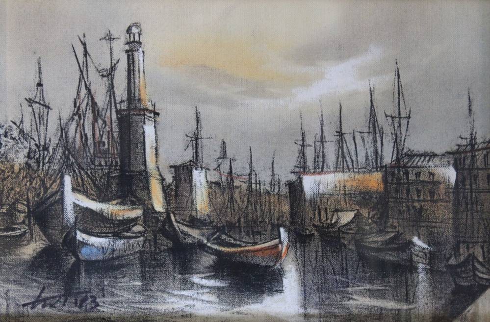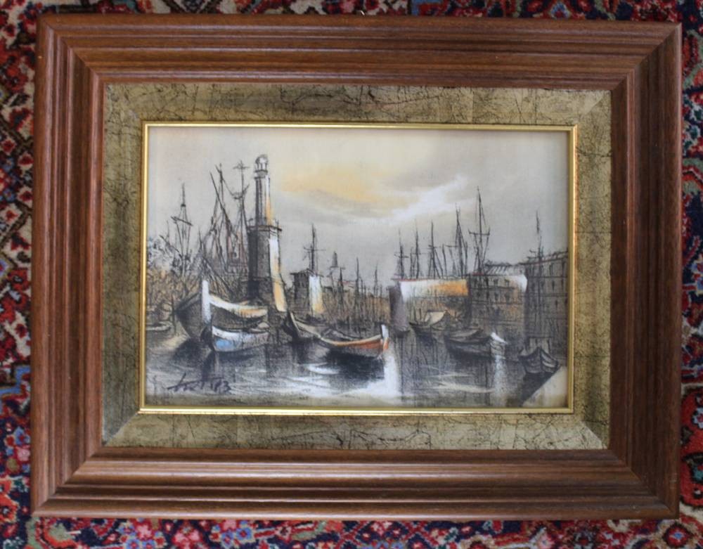unleserl.signiert '83, Hafenszene, Mischtechnik auf Stoff, ger./Glas, RG 34 x 44cm [1]
