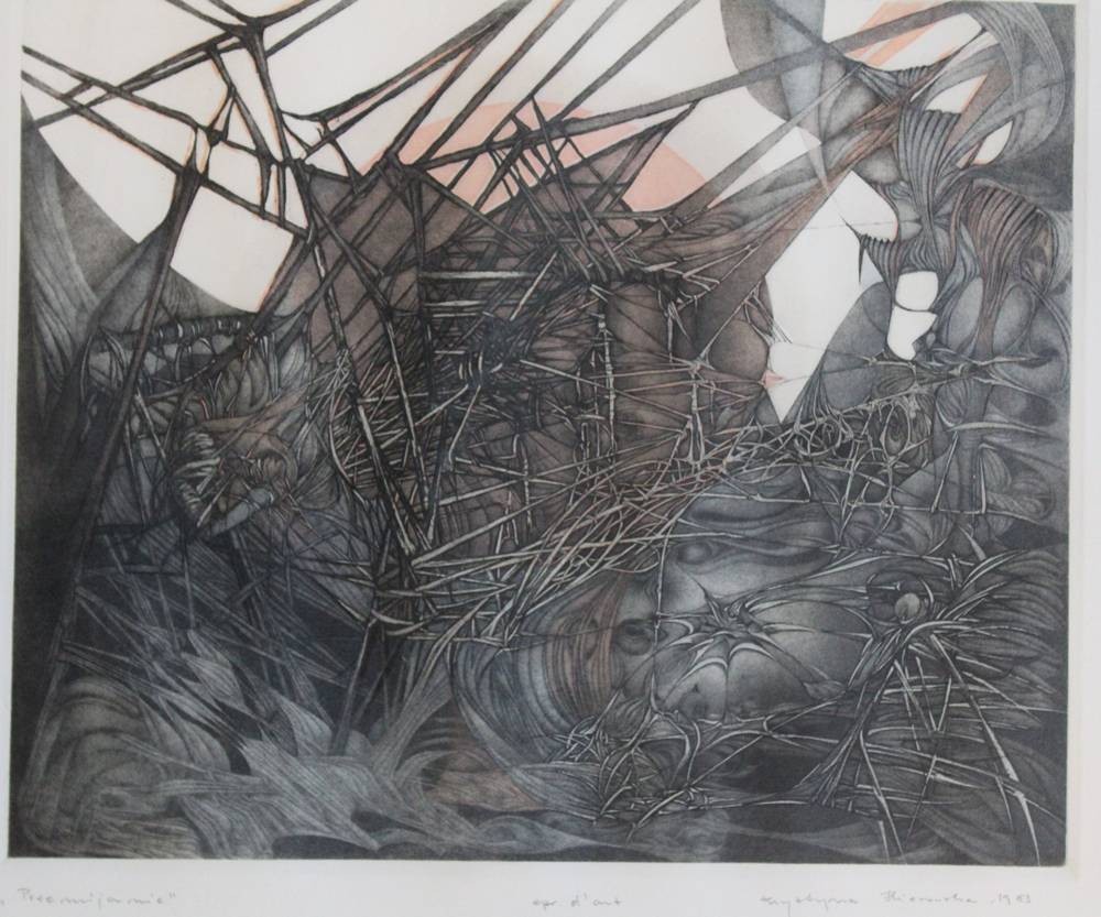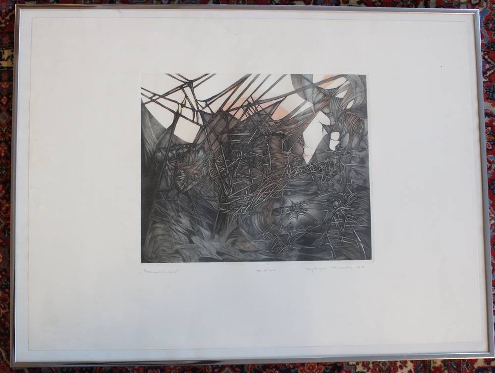unleserl. signiert, abstrakte Landschaft, RAdierung, betitelt "Przemijanie", ger./Glas, RG 81 x 62cm [1]