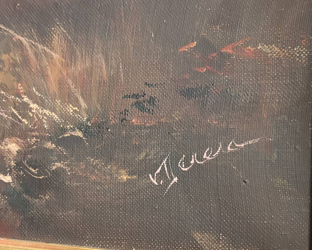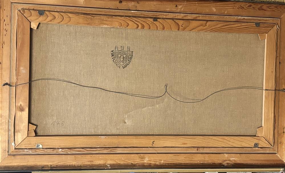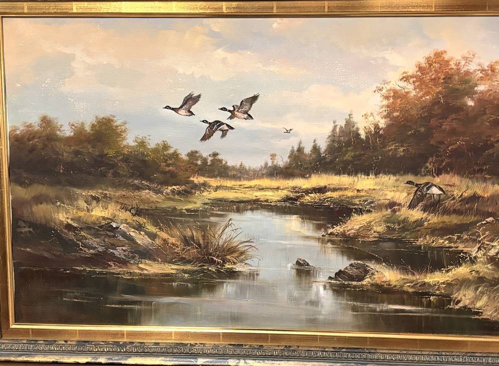 unleserl. signiert "auffliegende Enten" Öl/Leinen, gerahmt, RG 68x118 cm (eine Druckstelle-Sperrgut) [1]