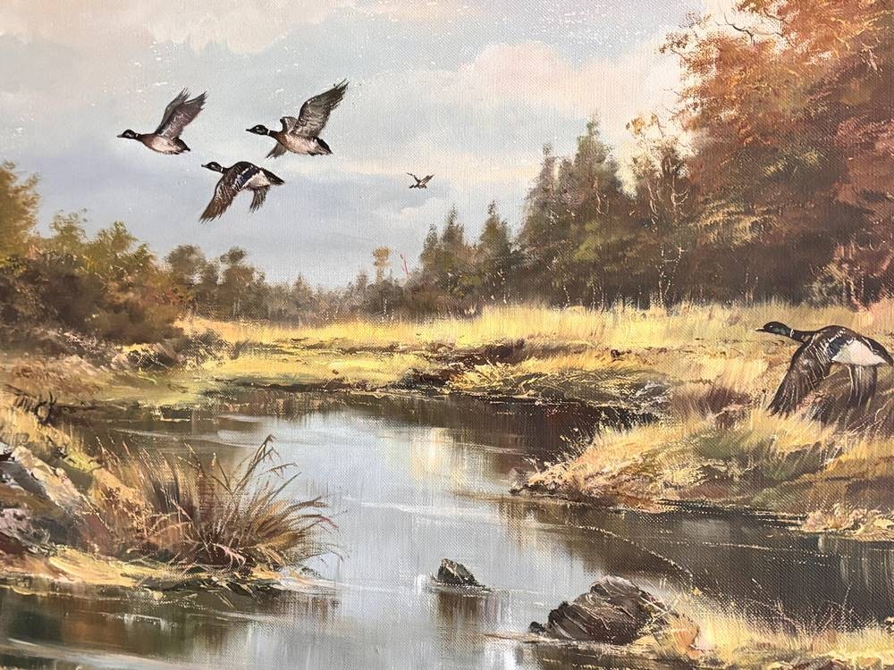 unleserl. signiert "auffliegende Enten" Öl/Leinen, gerahmt, RG 68x118 cm (eine Druckstelle-Sperrgut)